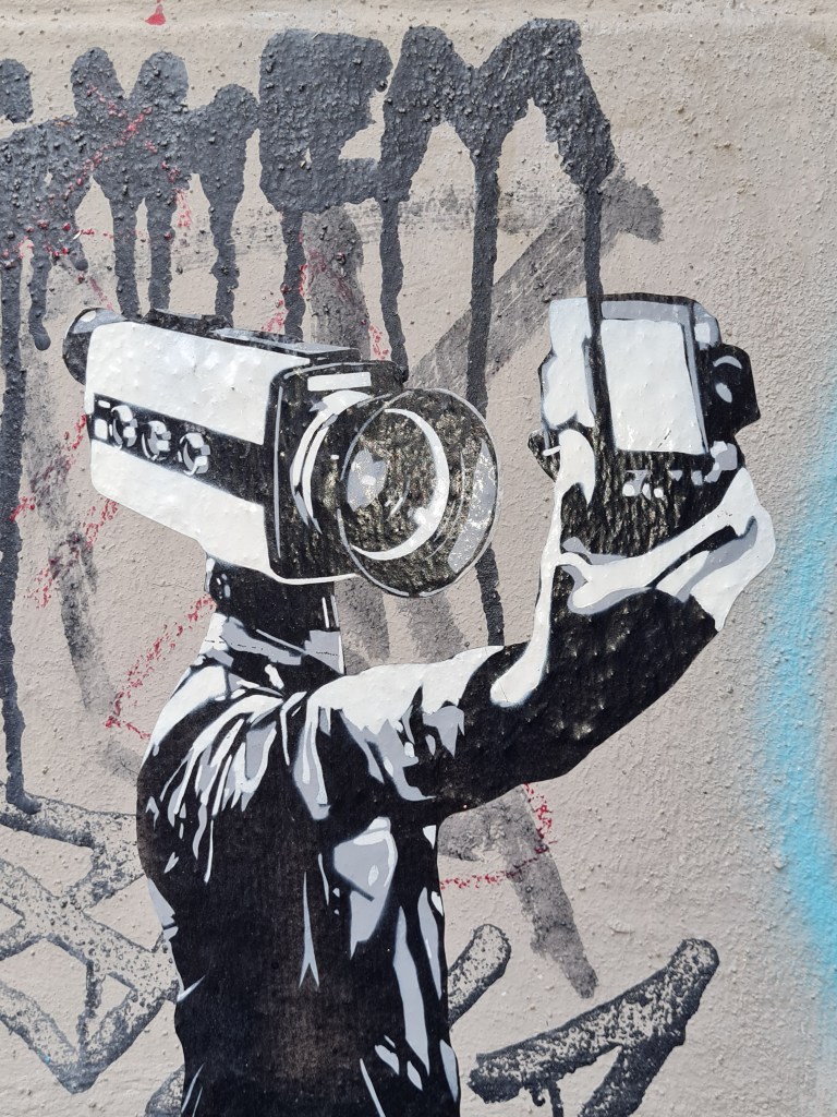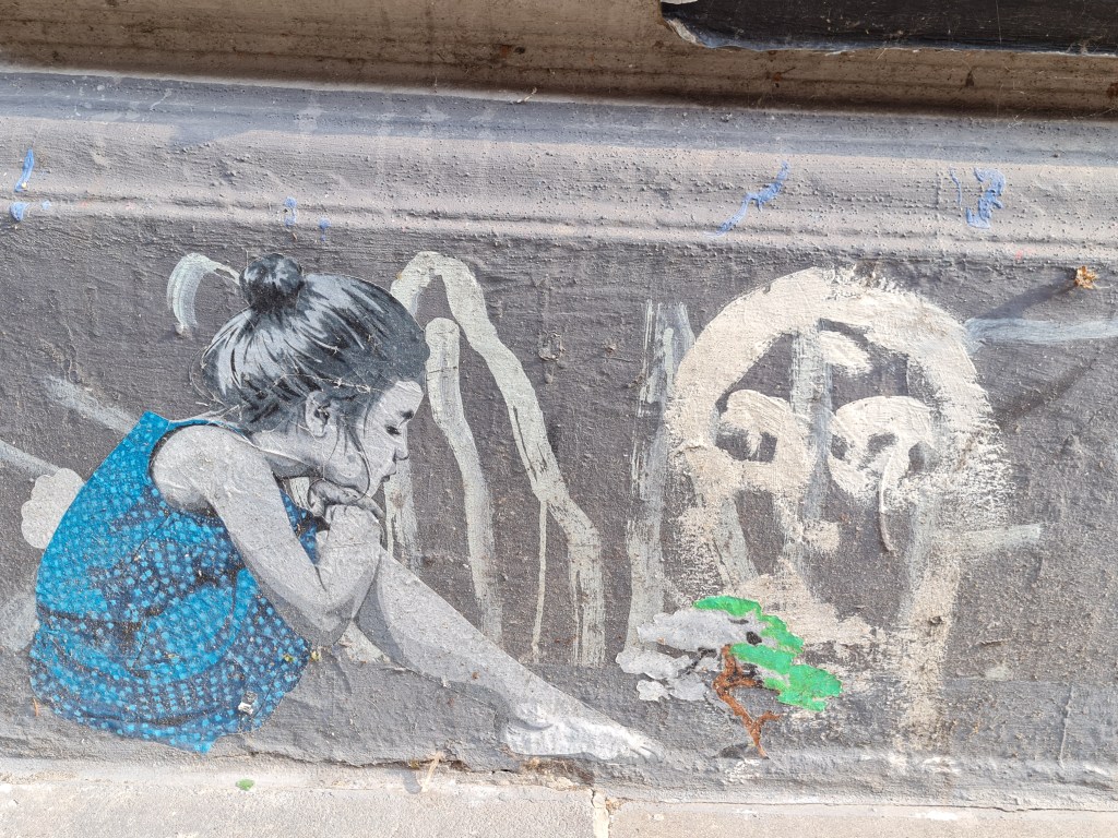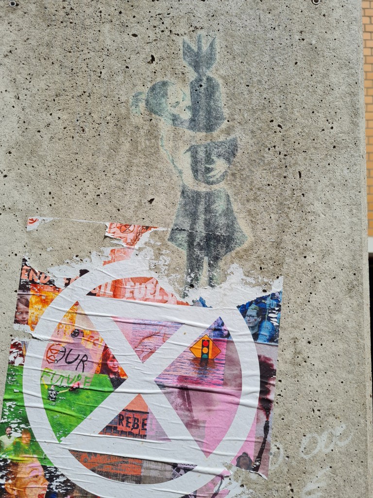 Um 13 Uhr 30 lief der IC in den Hauptbahnhof Hamburg ein, wo bereits der reguläre Zug wartete, um die Fahrgäste nach Sylt weiter zu geleiten. Bis Paul und Julian, mein ehemaliger Kollege an der Kanonikus-Kir-Realschule und jetziger Co – Trainer beim HSV, mit der Arbeit fertig sein würden, hatte ich noch gute 4 – 5 Stunden, weshalb ich mit der S – Bahn zu den Stadthausbrücken fuhr. Dort in der Nähe sollte sich ein Kunstwerk von Banksy höchst persönlich befinden. „The Bomb Hugger“ war schon etwas verblasst und Banksys gesprayte Signatur völlig unnötigerweise von Banausen überklebt.