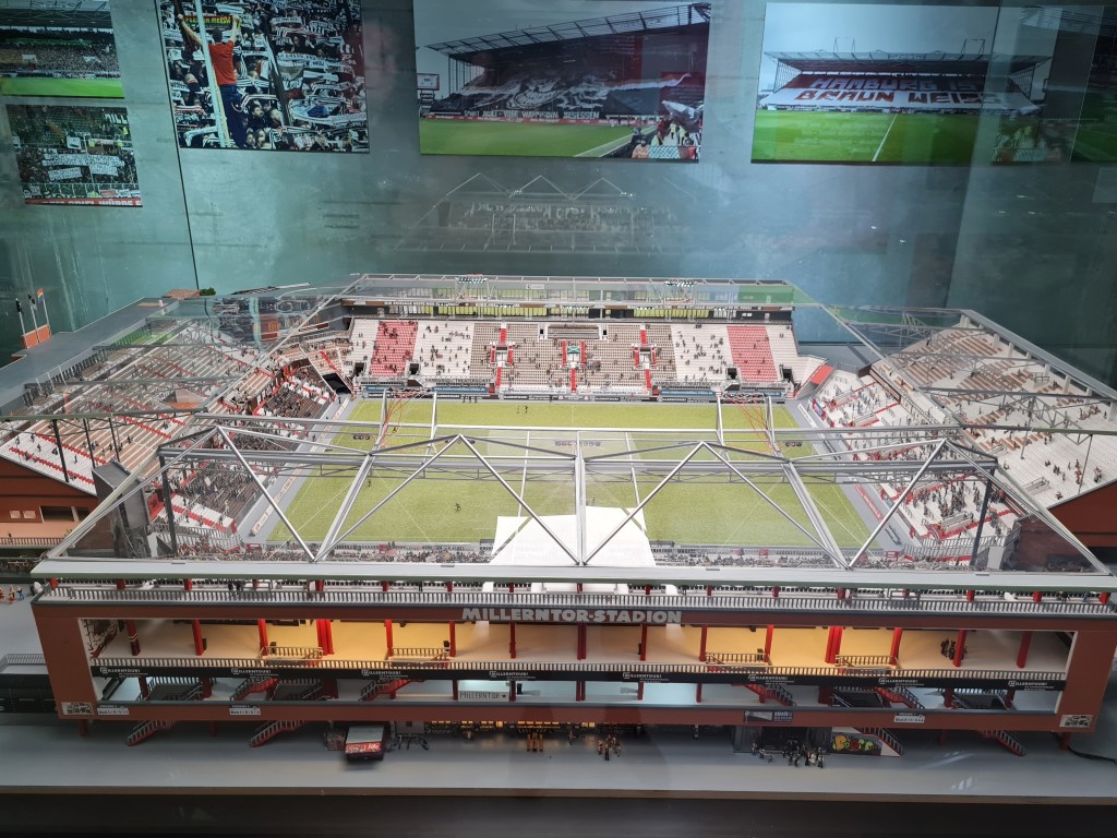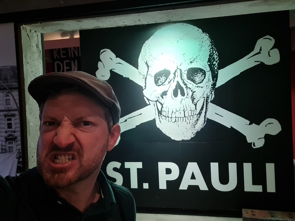 Im FC St. Pauli – Museum schaute ich mir die Ausstellung „Kiez Beben“ an. Diese zeigt die Anfänge der Vereinsgeschichte des ursprünglich meist klammen Kultclubs, der sich aus der national orientierten Turnerbewegung 1924 abspaltete und sein Aufstieg in Verbindung mit der linken Demonstrations- und Hausbesetzerszene St. Paulis erlebte.