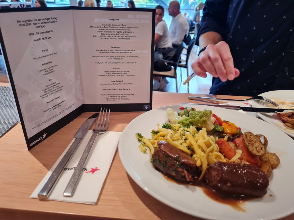 Leider musste der HSV schon früh einem herben Rückstand hinterher rennen. Die Lilien aus Darmstadt erzielten ihre ersten Treffer bereits in der 4. und 7. Minute. So war der Käse schon fast früh gegessen. Die Rothosen konnten auch vor der Pause nicht mehr verkürzen. In der Halbzeit stand der nächste Gang im Vereinsheim für uns bereit – u. a. Currywurst und Kaiserschmarn. Die 2. Halbzeit verbrachten wir in der ehemaligen „Emirates Loge“, direkt in Höhe der Mittellinie, da Paul dort einen Bekannten hatte. Das Spiel geriet dort etwas in den Hintergrund. Und hinter der Glasscheibe lässt sich für meinen Begriff die Stimmung auch nicht so auffangen. Gerade, weil es langsam hitzig wurde. Der Hamburger Sport Verein erzielte erst in der letzten Viertelstunde einen Treffer. Doch auch Darmstadt gelang noch ein Tor zum 1:3, dem späteren Endstand. Bei den Hamburgern lagen mittlerweile die Nerven blank. Insgesamt führten sie im Gegenzug mit 3:0 Platzverweisen. Das war wohl nichts. Shitpolpelei! Julian war natürlich betröppelt, als er nach dem Spiel zu uns dazukam. Dennoch verbrachten wir noch einige Stunden bei bester Unterhaltung in der Loge, bis es heimwärts ging. Alex holte uns netterweise mit dem Auto am Stadion ab.