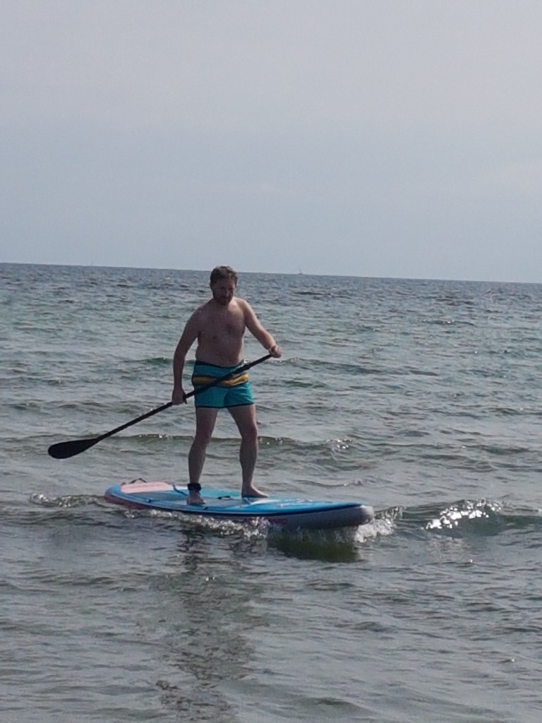 22.08.2022 – Frank hatte in den letzten Tagen seinen Windsurfgrundkurs in Theorie und Praxis erfolgreich absolviert und mich motiviert, ebenfalls mal aufs Brett zu steigen. Da traf es sich ganz gut, dass heute ein Schnupperkurs angeboten wurde. Bis dieser um 14 Uhr 30 startete, bestand nach dem Frühstück noch die Gelegenheit am Strand sich ein SUP zu leihen. Eine gute Stunde verbrachten wir auf der zur Ostsee offenenen Meerseite und hatten bei dem Wellengang anfängliche Probleme uns über Wasser zu halten. Mit der Zeit hatten wir allerdings den Dreh raus.