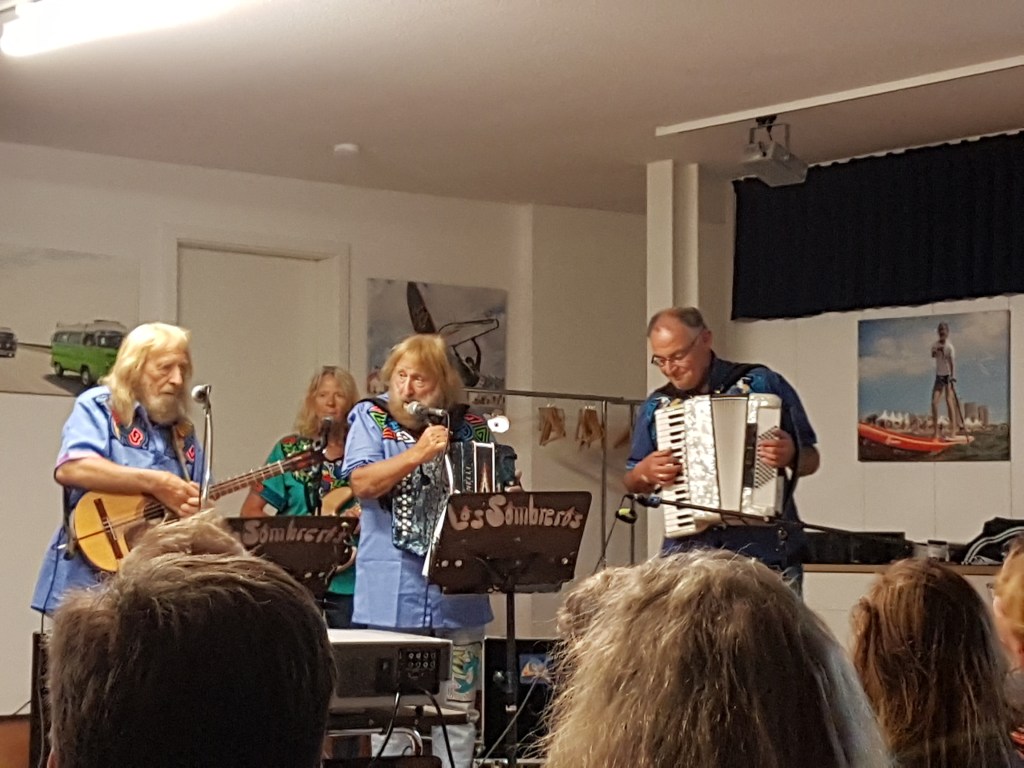Gegründet wurde die Windsurfschule von den Charchulla – Zwillingen als erste ihrer Art auf Fehmarn 1972. Nicht nur deswegen erlangten ihre Gründer Jürgen und Manfred als Pioniere an Bekanntheit. Auch als „Los Sombreros“ oder als „Steeldrum – Twins“ sind sie als Musiker eine auf Fehmarn nicht wegzudenkende Einrichtung, sodass wir uns abends einen Filmvortrag mit Musik der Kombo „Los Sombreros“ anschauten. Die bereits 80 – jährigen Zwillinge berichteten im Stile alter Seebären und Weltenbummler von einer ihrer Reisen nach Nicaragua. In dem Land Latainamerikas reisten sie nach Ometepe, einer Insel auf einem gigantischen Binnensee mit gleich zwei Vulkanen. Neben Natureindrücken durfte der ein und andere Schwank aus ihrem bewegten Globetrotterleben nebst Seemannsgarn nicht fehlen. Eines muss man zugeben: Auch in hohem Alter sind die beiden absolute Entertainer geblieben.