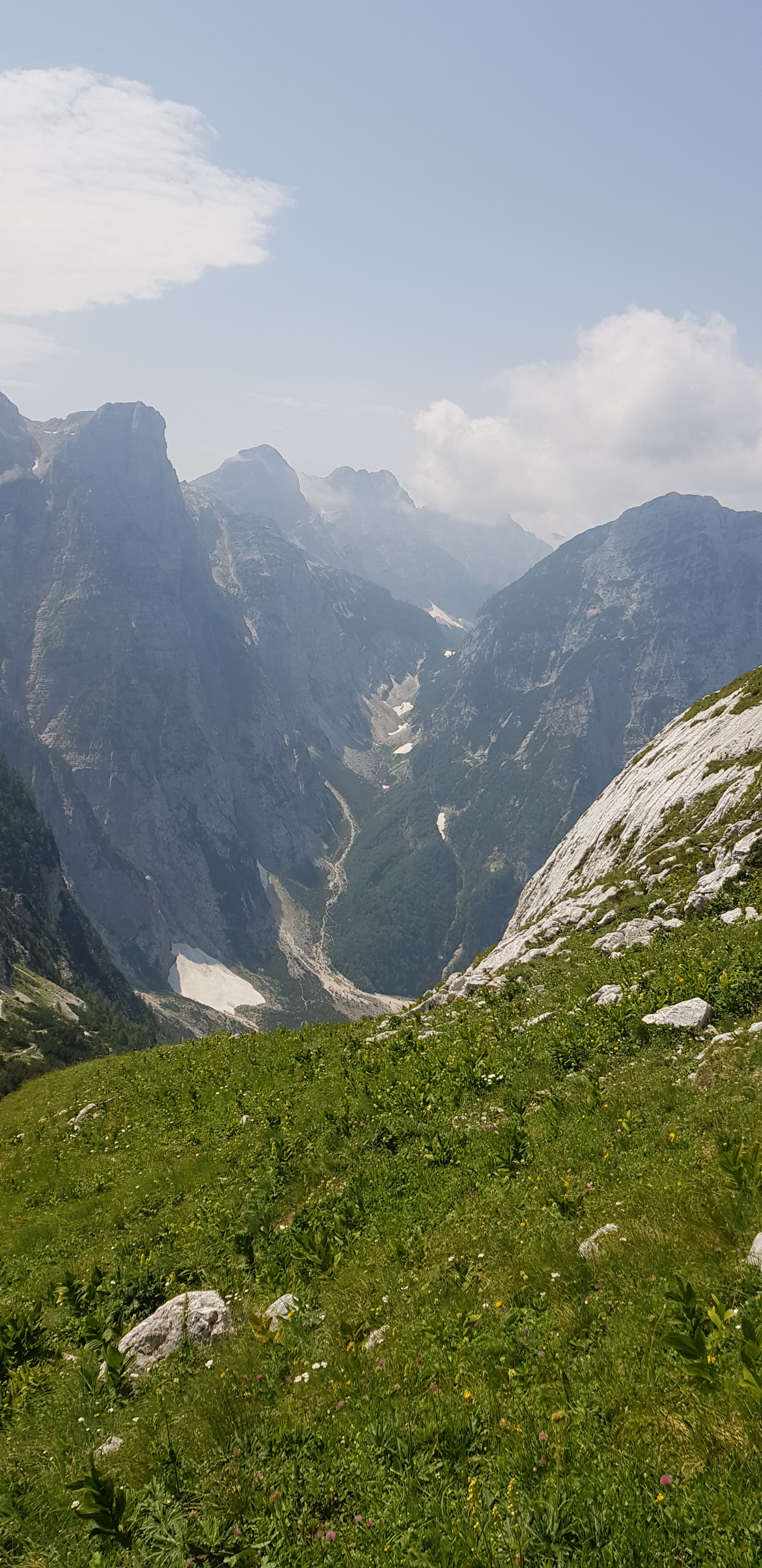 Nach dem Frühstück fuhren wir nach Mojstrana, um am Aljazev Dom auf den 1758 Meter hoch gelegenen Luknja zu steigen. Von da aus hatte man einen phänomenalen Blick auf den höchsten Berg Sloweniens, den Triglav mit 2864 Metern Höhe, und runter ins Vrata Tal, durch das wir uns heute regelrecht durchkämpfen mussten.