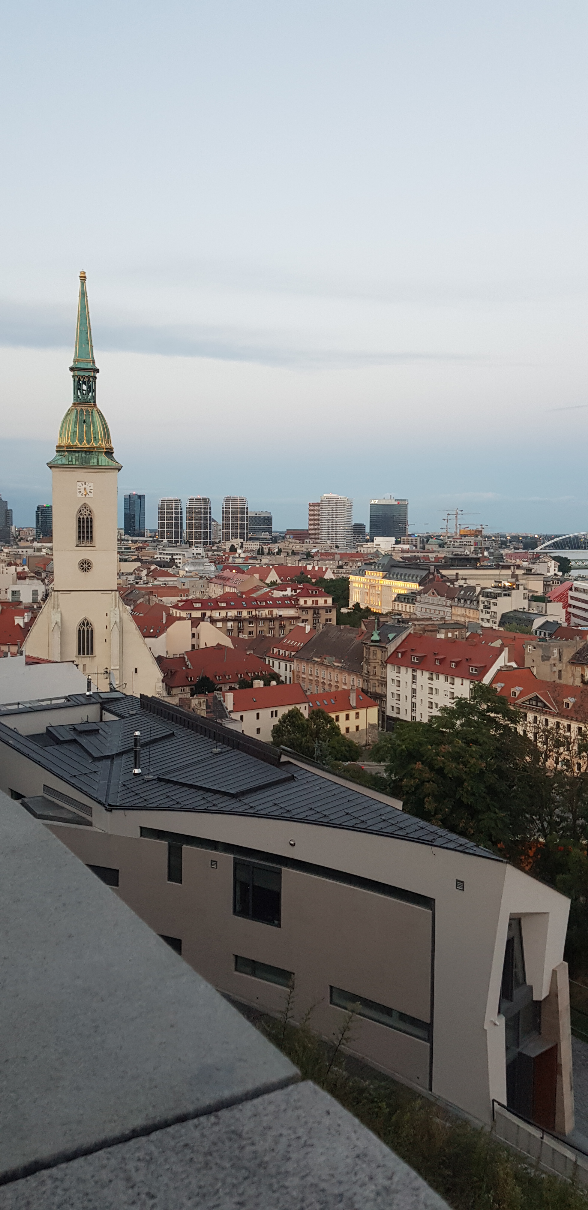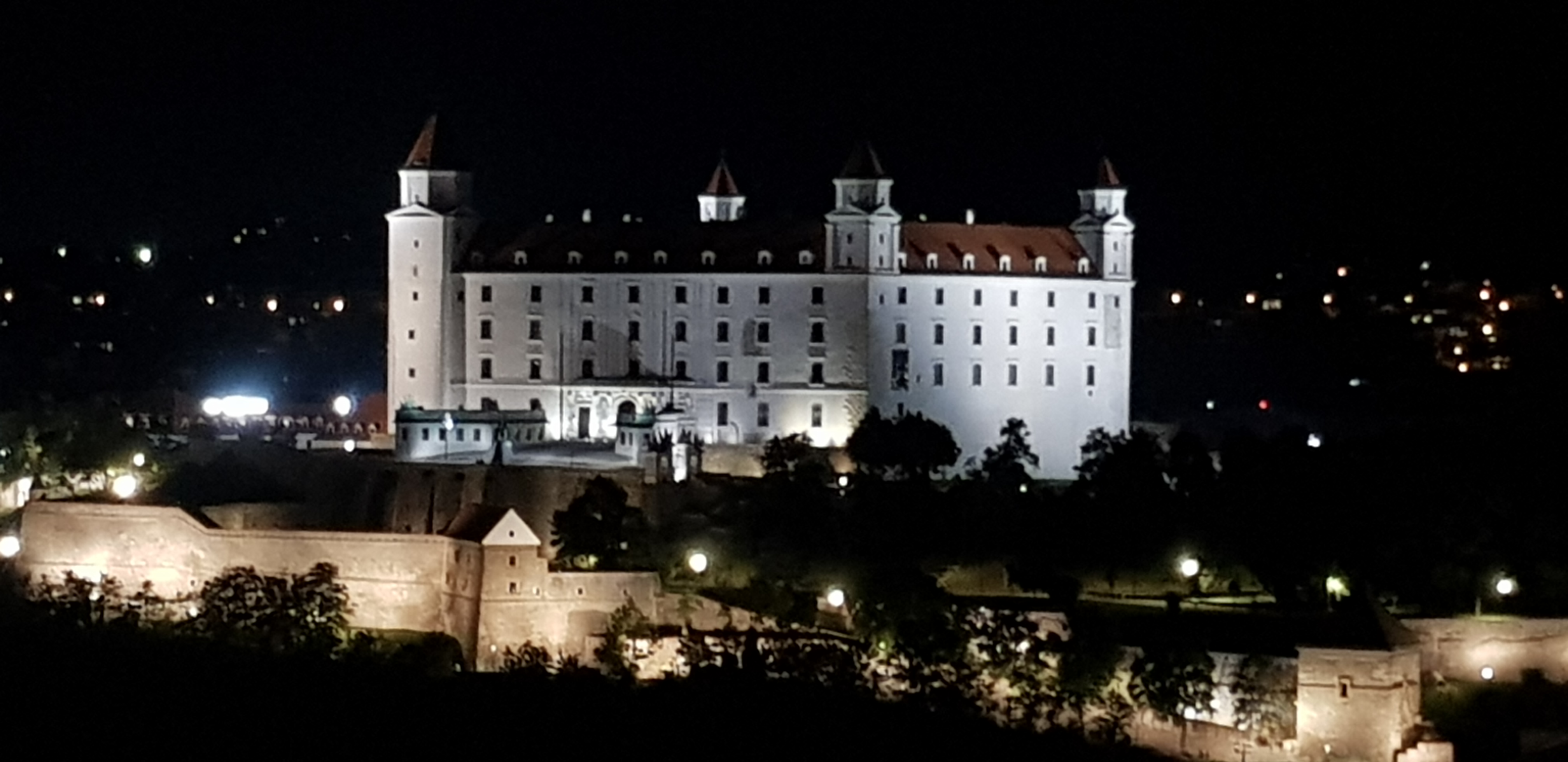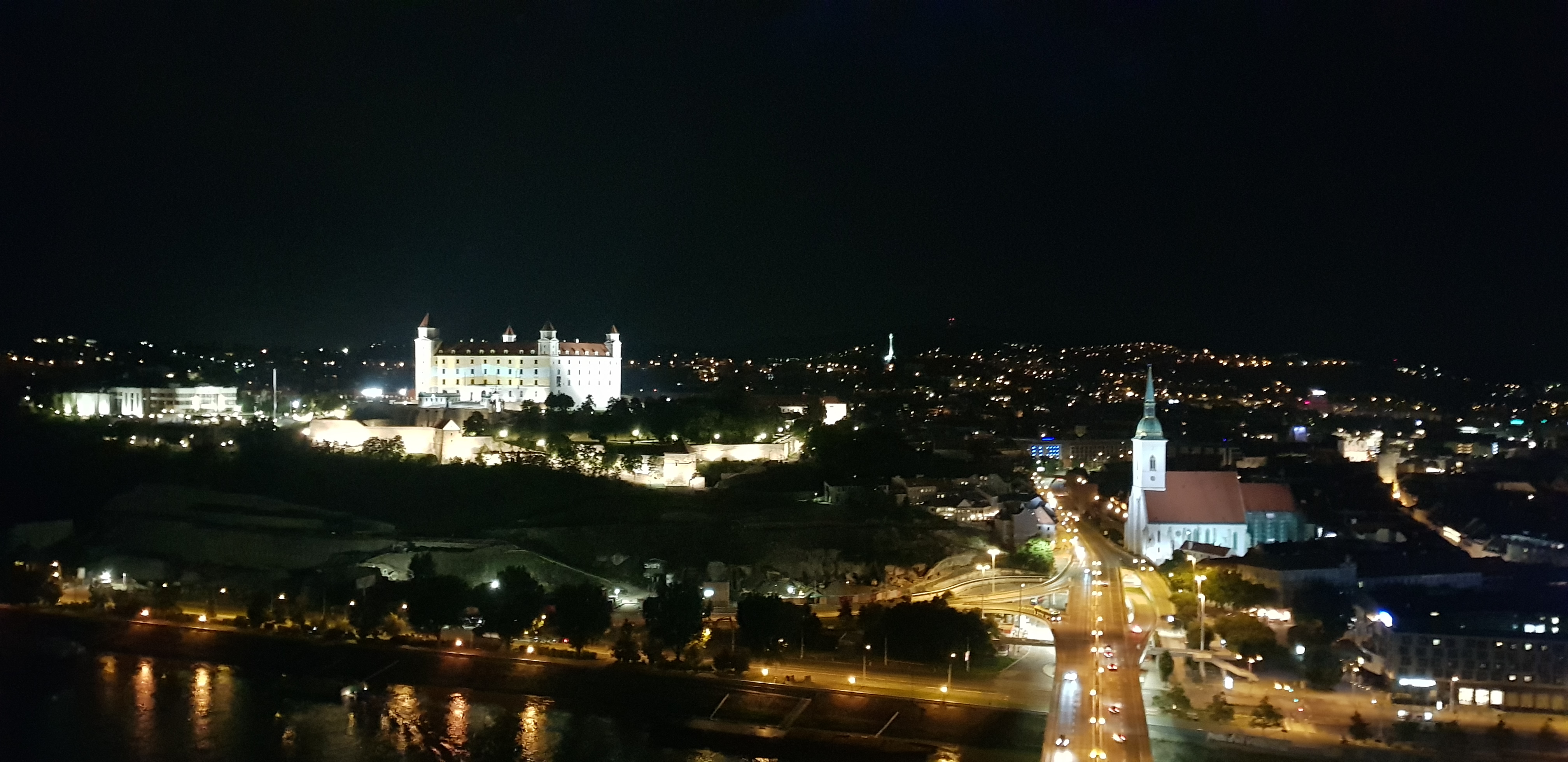 Die ganze Strecke von rund 15 Kilometern mussten wir natürlich nach Burgbesichtigung mit Ausstellung zur Burggeschichte zurück und belohnten uns erneut mit traditioneller slowakischer Küche. Daraufhin konnte einer von wenigen kurzen Powernaps in den letzten Wochen eingelegt werden, bevor wir uns auf den Weg zum UFO begaben, um dieses Mal den Blick bei Sonnenuntergang auf Donau, Altstadt und die Bratislaver Burg zu werfen. Der Aussichtsturm ist 95 Meter hoch und bietet bei gutem Wetter eine herrliche Aussicht bis zu 100 Kilometer ins Umland. Im 360°-Restaurant unter der Aussichtsplattform durften wir feststellen, dass auch die Slowaken guten Wein keltern können.