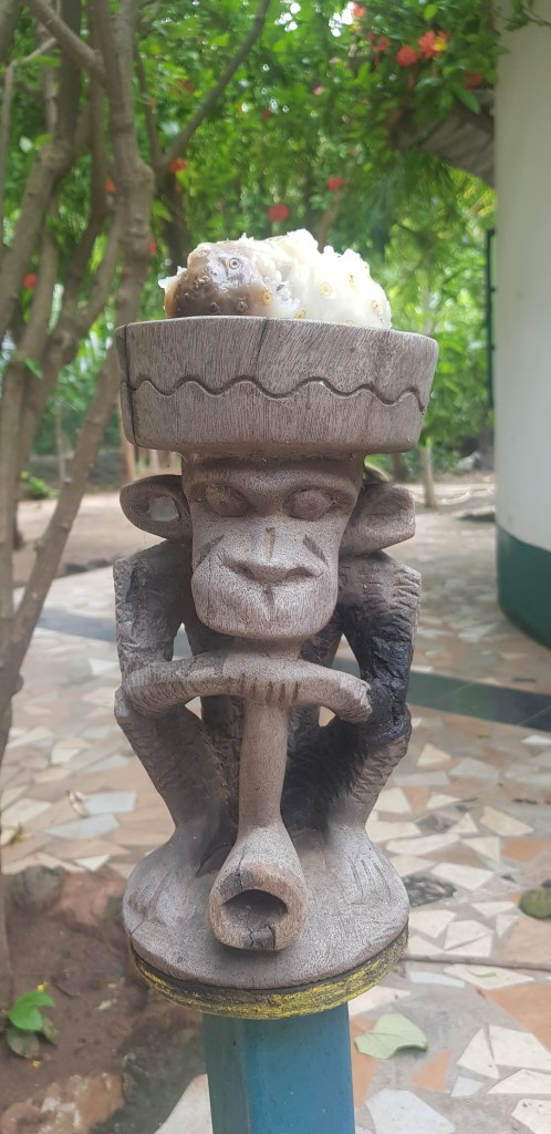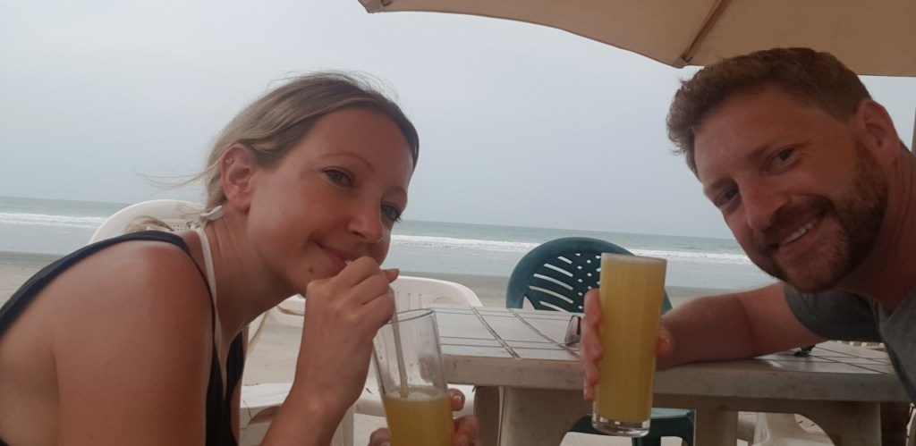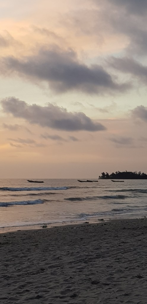Meine erste Mahlzeit wollte ich mittags im Solomons mit herrlichem Blick auf das Meer einnehmen. Ein ungutes Gefühl begleitete mich dabei, weil zwei Männer bei gelbrot gehisster Warnflagge eine gute halbe Stunde raus aufs offene Meer schwommen, um, wie ich zuerst dachte, zu ihrem dort ankerten Fischerboot zu gelangen. Sie wurden mit der Zeit von der Richtung des Bootes abgetrieben, die Bewegungen wurden schneller und sie schwammen an den Strand zurück. Die Gedanken an die Gefahr des Ertrinkens ist mir hier stets präsent. Gestern erfuhr ich, dass neben Unterernährung und Malaria (hauptsächlich bei Kindern) ebenso das Ertrinken eine der häufigsten Todesursachen in Gambia ist.