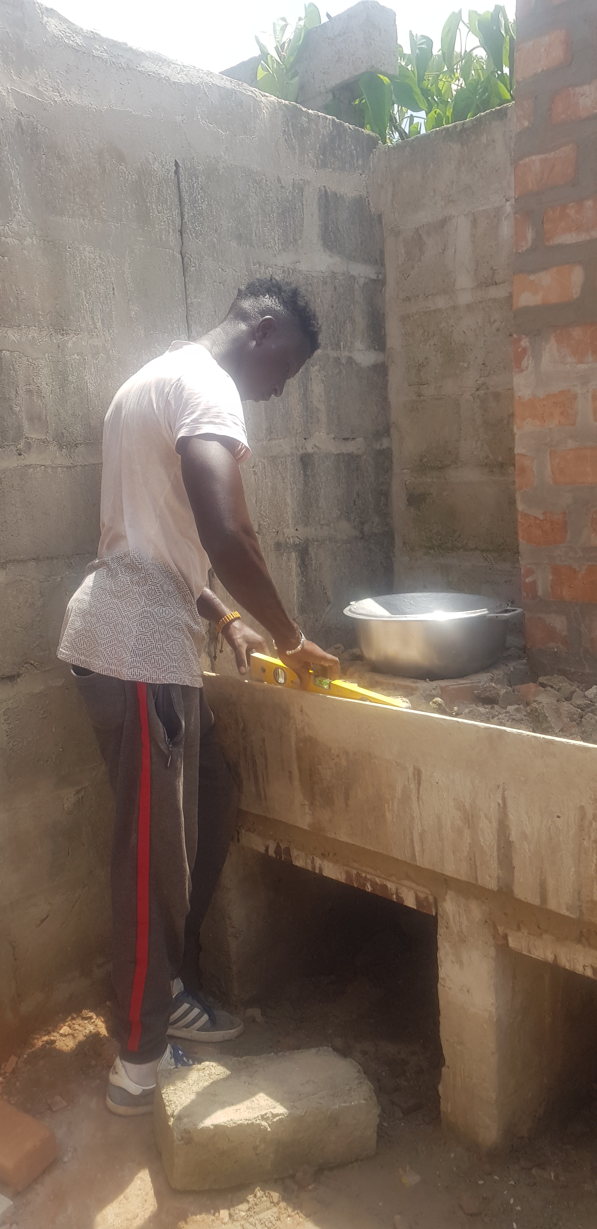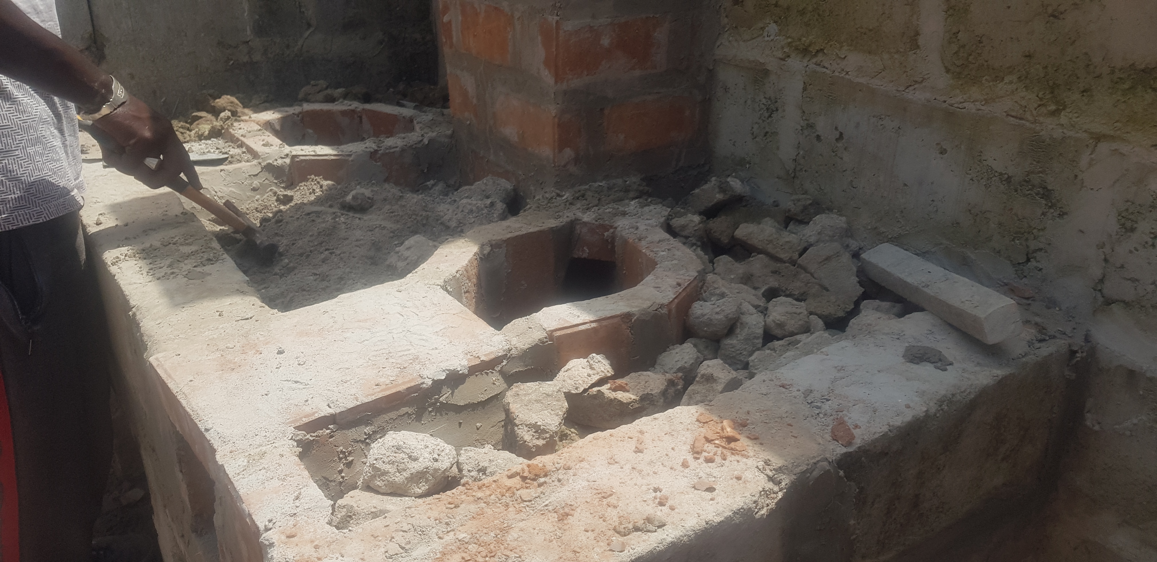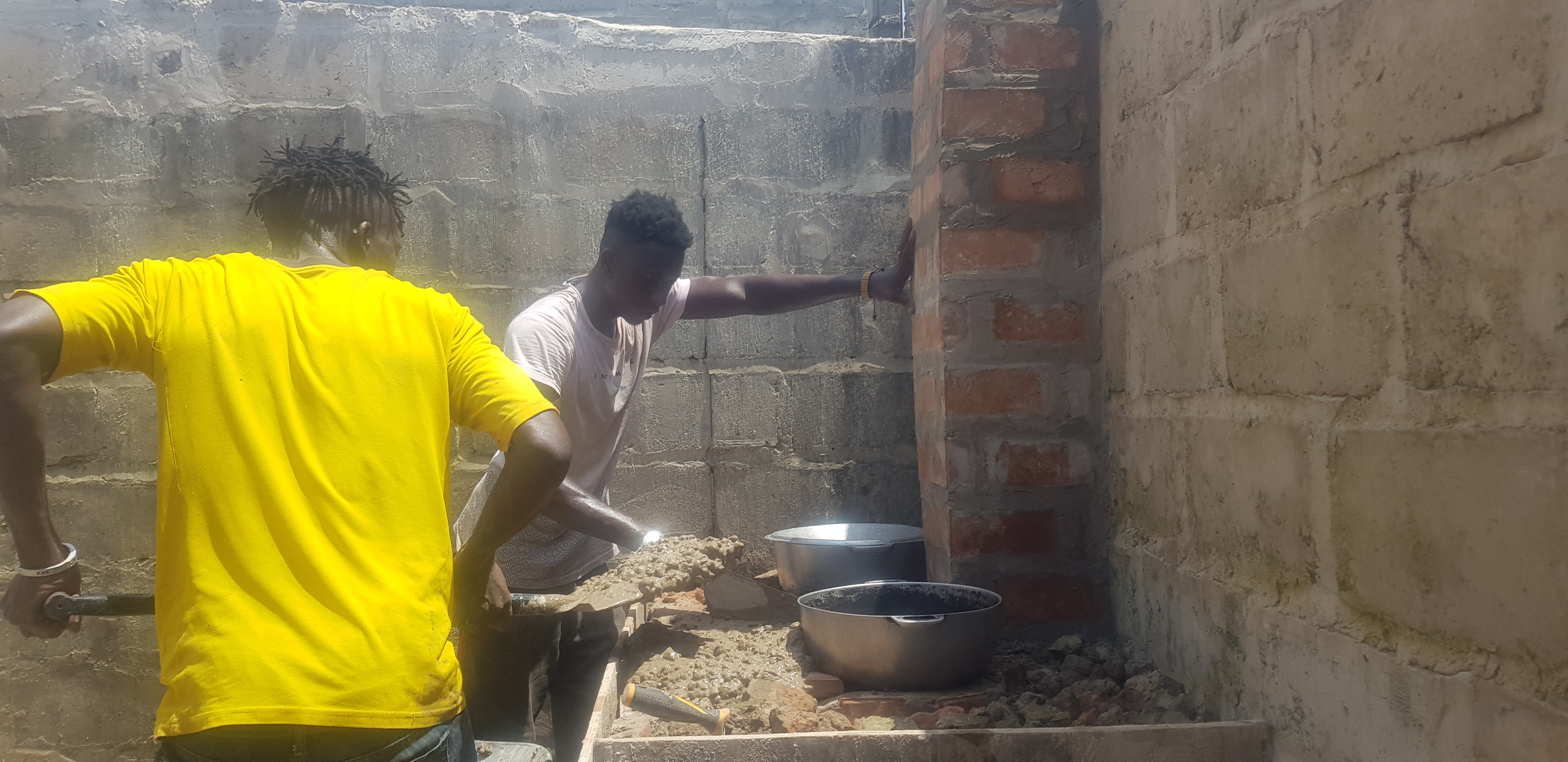Die Kochtöpfe wurden auf die Backsteinblöcke aufgelegt, dann einbetoniert und später sanft aus dem abgehärteten Beton herausgedreht, sodass sich Alui auf ihre neue Kochstelle freuen konnte.