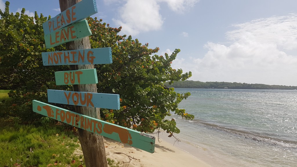 14.12.2021 – Gut gestärkt starteten wir mit dem Dinghi, einem Beiboot, zur nahegelegenen Hog Island, über die mich William und Kate bis zum Yard, dem Hafen samt Werft und wo sich auch Steffens Reparaturwerkstatt für Schiffe „Driftwood“ befindet, herumführten. Auf schlammigen Wegen durch die Mangroven, zwischen denen Einsiedlerkrebse ihre „Häuser“ wechselten, erreichten wir einen kleinen Strand, an dem wir Mandeln fanden und knackten, Muscheln suchten und einen über 100 Jahre alten Kräutergarten inspizierten. Neben allerlei Essbarem gibt es allerdings ebenfalls giftige Bäume und Sträucher, vor denen man sich in Acht nehmen muss.