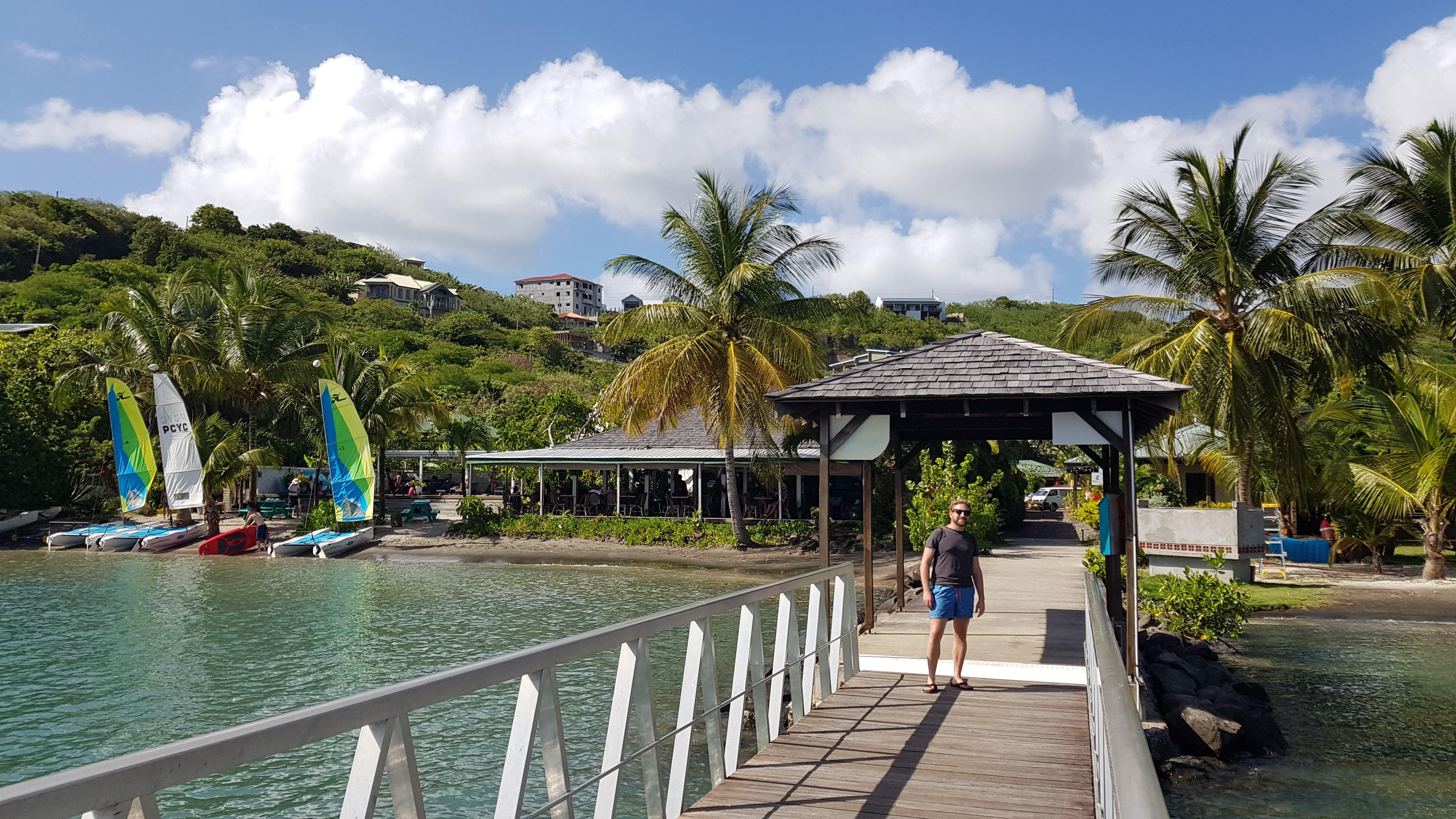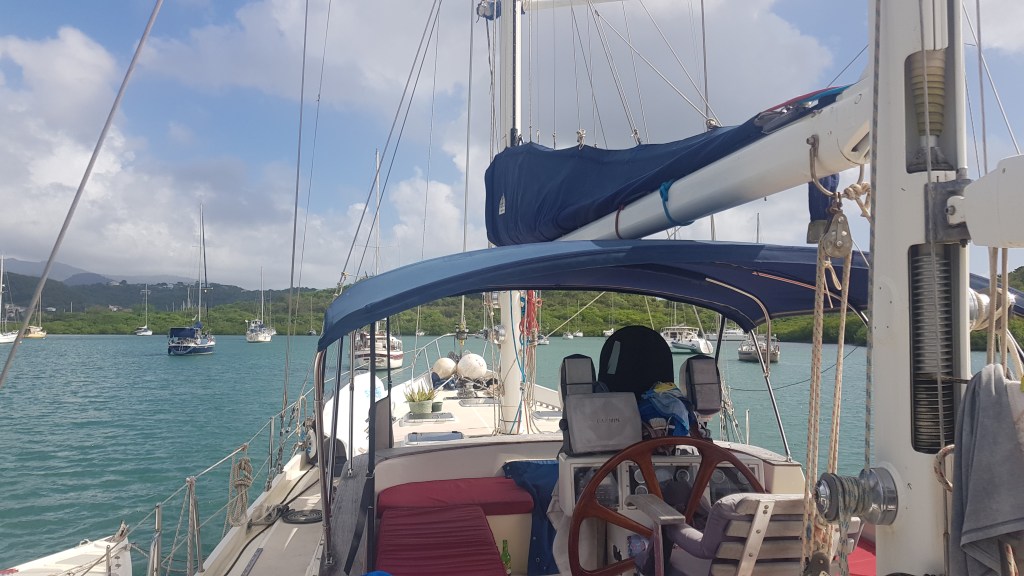 Dann bauten wir Solarpannels ab, ich lernte Begriffe und Knoten, sowie Notwendiges über die Steuerungselemente. Als Letztes schafften wir eine alte 50 Kilobatterie an Land und gönnten uns Lunch in der Hafenbar „Cruisers Galley“. Das war bitter nötig. Dabei konnten wir uns mit den Einreiseformalitäten für Martinique beschäftigen.