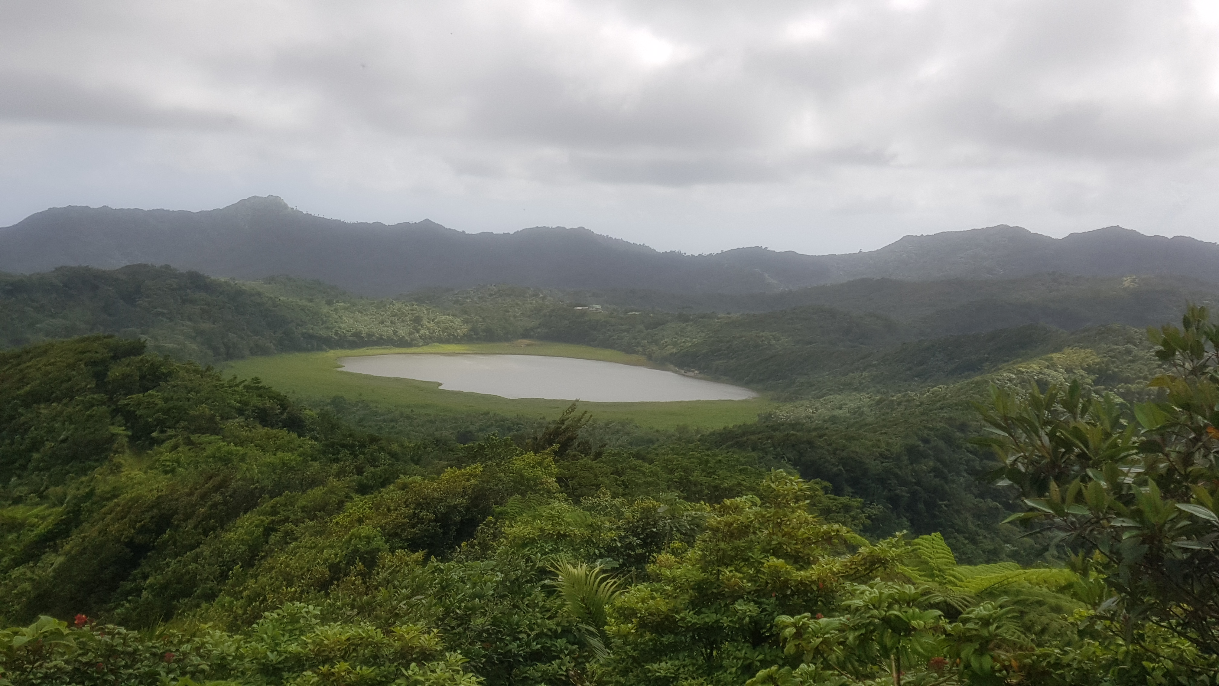 16.12.2021 – Bevor das Geburtstagskind Steffen seine Pritsche verließ, schmückten wir den Wohn-/Essbereich und Kate bereitete ein großes Frühstück zu. Nach reichlicher Stärkung holten wir Marcel, der mit seiner „Ti Odara“ auch hier ankert, ab und fuhren weiter, um den Mount Qua Qua zu besteigen. Dieser ist nicht nur der 2.-höchste Berg Grenadas mit über 700 Metern, sondern gleichsam ein alter Vulkan mit Kratersee, auf dessen Rand wir stiegen und über den Grat entlang wanderten. Palmen, Stauden, Bambus und mit Efeu umschlungene Bäume wechselten sich ab, dazwischen schauten Sträucher und Riesenfarn hervor oder Lianen hingen herab. Der schlammige, teils sehr rutschige und enge Weg führte uns an einen Aussichtspunkt über den Westen der Insel und auch zwischendurch konnte man seinen Blick immer mal wieder schweifen lassen.