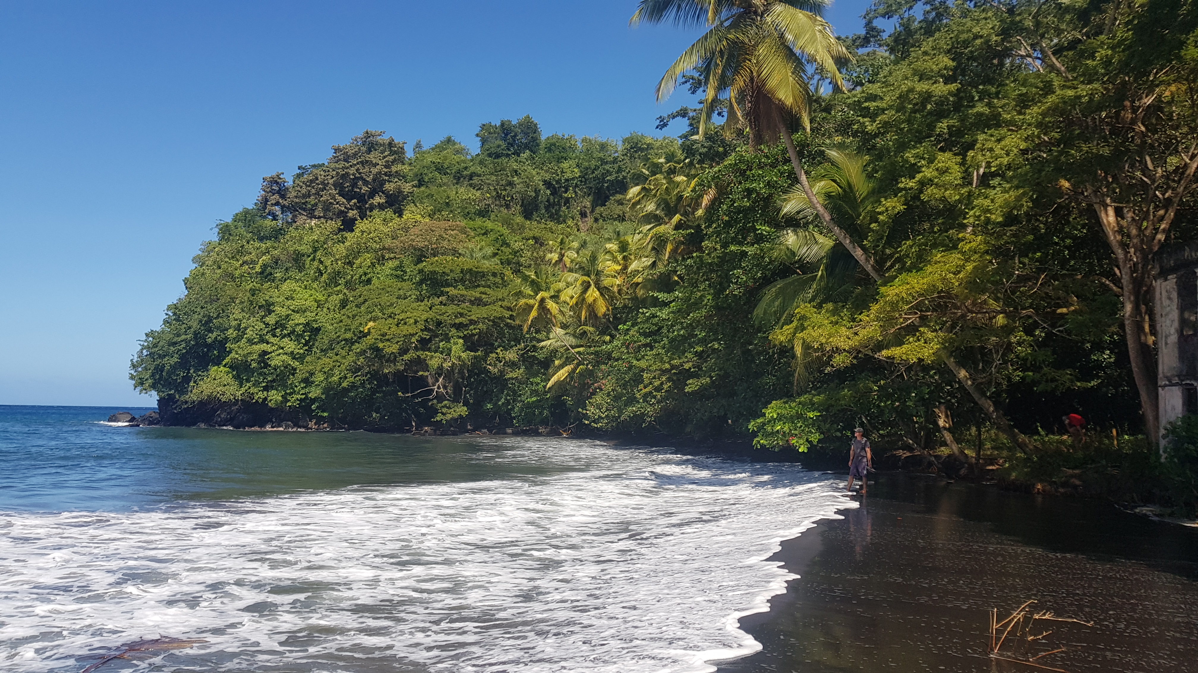 Weiter ging es an der Westküste entlang nach Black Bay, wo wir unseren Jeep im Busch parkten und zu Fuß weiter zu einem schwarzen vulkanischen Sandstrand wanderten. Dabei zeigte sich erneut die enorme Vielfalt von Fauna und Flora Grenadas. Ananas, Bananen, Kokosnuss, Mangos, Brotfrucht, Muskatnuss, Mandeln, Kakao, … verhungern würde man hier nicht. Zudem wuchs zwischen den Bäumen und Palmen neben gigantischem Bambus auch mal ein Spikebaum, an den man sich gewiss nicht anlehnen sollte.