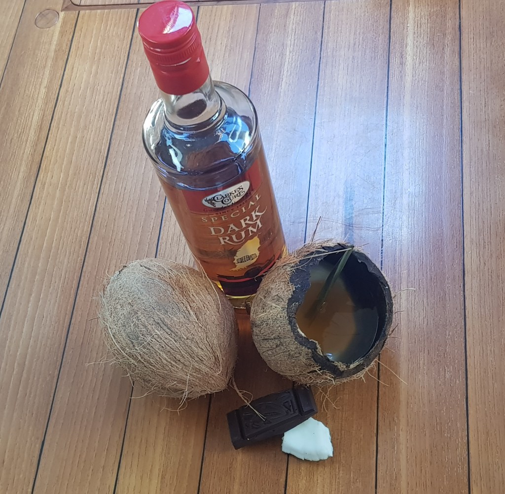 20.12.2021 – Zum Frühshoppen habe ich meinen eigenen karibischen Cocktail kreiert – den „Grenada f(e)i(g)thing Pirate“! Man nehme dabei eine Kokosnuss, hacke das obere Drittel hinweg, schlürfe die Kokosmilch in Gänze, genieße das Kokosfleisch pur a la naturelle und lege ein wenig bei Seite zum späteren Verzehr. Nun fülle man die geöffnete Kokosnuss zu einem Drittel mit Clarkes Court Bay Dark Rum, füge ein Schuss Ginger Beer hinzu und veredle es mit einem angeriebenen Stück Lemongras. Vortrefflich entfaltet der „Grenada f(e)i(g)thing Pirate“ seinen Geschmack auf Zunge und Gaumen, wenn man ihn im Wechsel mit Kokosnussfleisch und dunkler Schokolade, mindestens 82 %, kredenzt und genießt. „Trinkt aus Piraten, joho!“