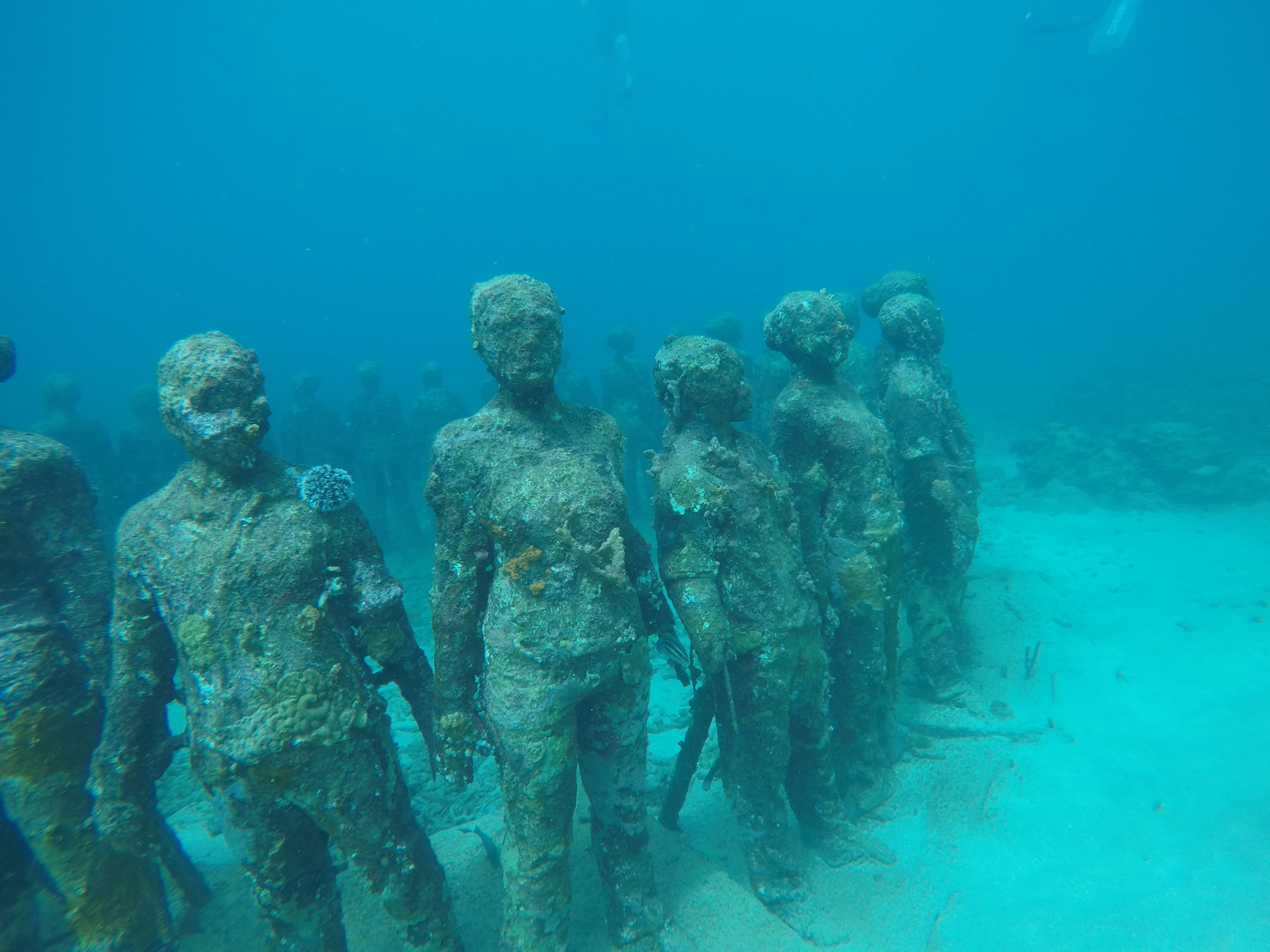 23.12.2021 – Definitv war der Besuch des Unterwasserskulpturen Parks zwischen Dragon Bay und Molinaire Beach ein absolutes Highlight. Um die unter Wasser versenken und fest installierten Darstellungen betrachten zu können, mussten wir nicht nur teils 6 – 7 Meter tief tauchen, sondern auch erstmal von einer Nebenbucht dorthin schnorcheln. Wir waren ja nicht mit einem Glasbodenboot unterwegs und die paar hundert Meter dorthin auf offener See den Riffen entlang haben sich mehr als gelohnt. Neben zahlreichen exotischen Fischen (wie Papageien-, Angler-, Drücker-, Schnapper-, Trunk-, Ziegen, Trompeten- oder Schmetterlingsfische, …) bestaunte ich Anemonen, Schwämme und Korallen, welche die Riffe bevölkerten. Allein das war schon faszinierend. Uns trieb sogar eine „Eingeweidenqualle“ entgegen und kaum, dass man sich versah, war man in Mitten eines riesigen Fischschwarms.