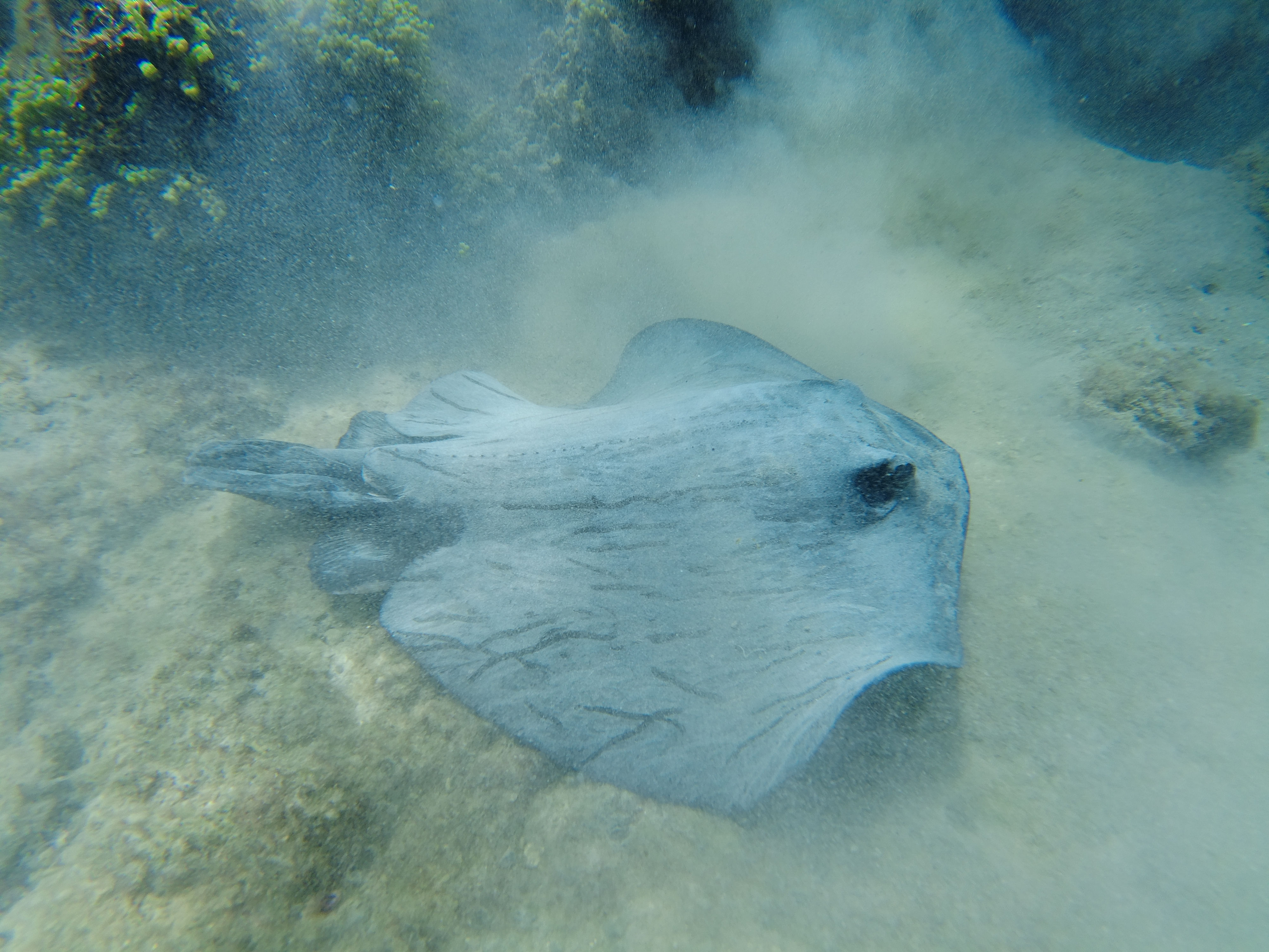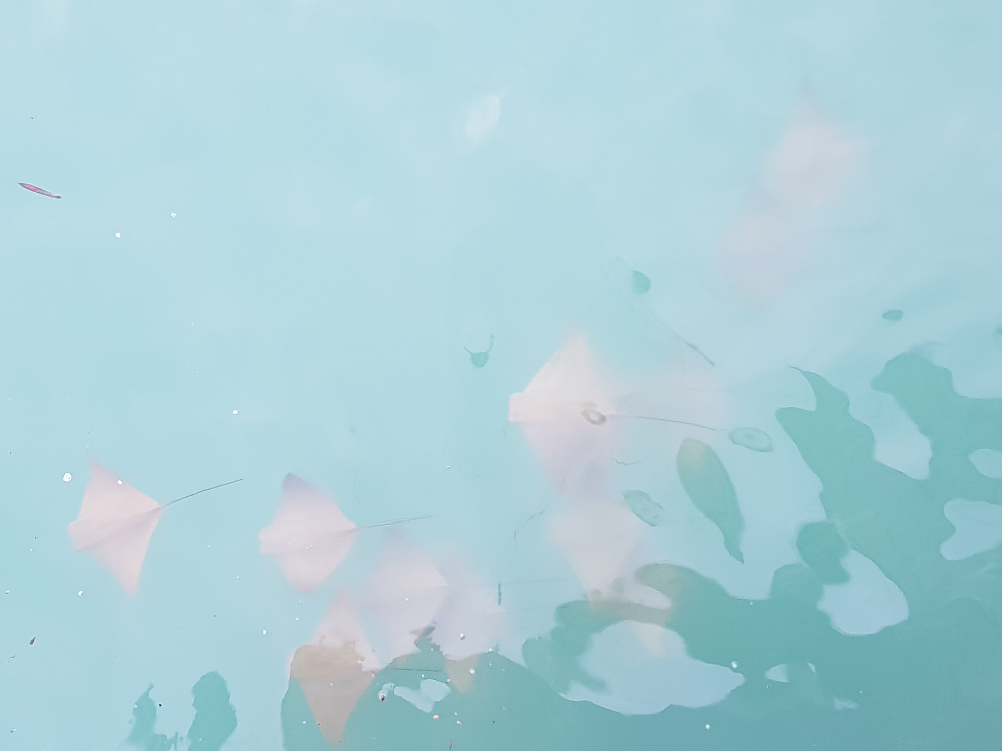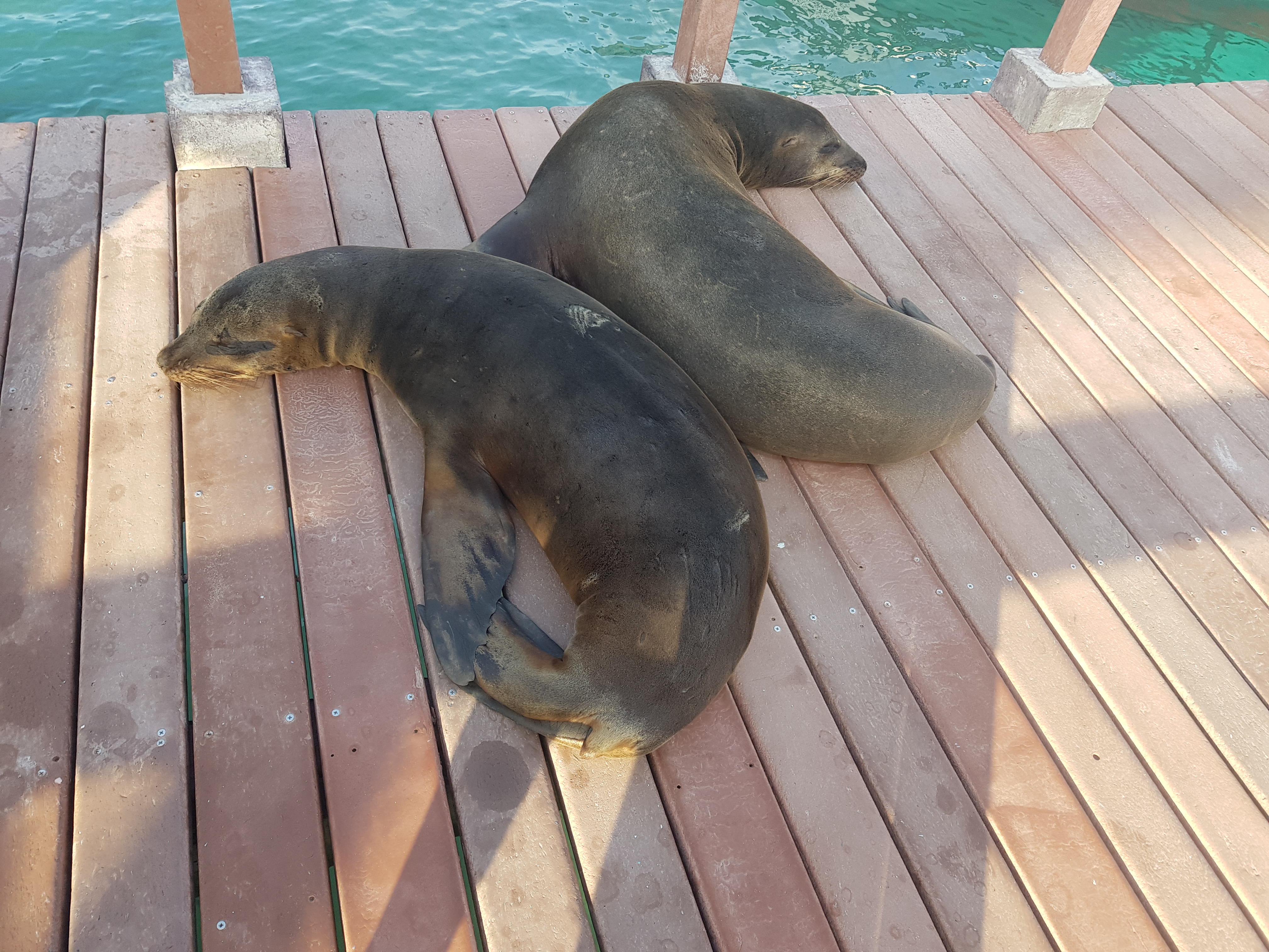 Zurück im Hafen bot sich ein tolles Schauspiel. Seelöwen lagen herum, eine große Meeresschildkröte war auf der Suche nach Essbarem, kleine Schwarzflossen Riffhaie zogen ihre Kreise und eine Horde Golden Rays (Mantarochen) schwomm umher. Wirklich faszinierend.