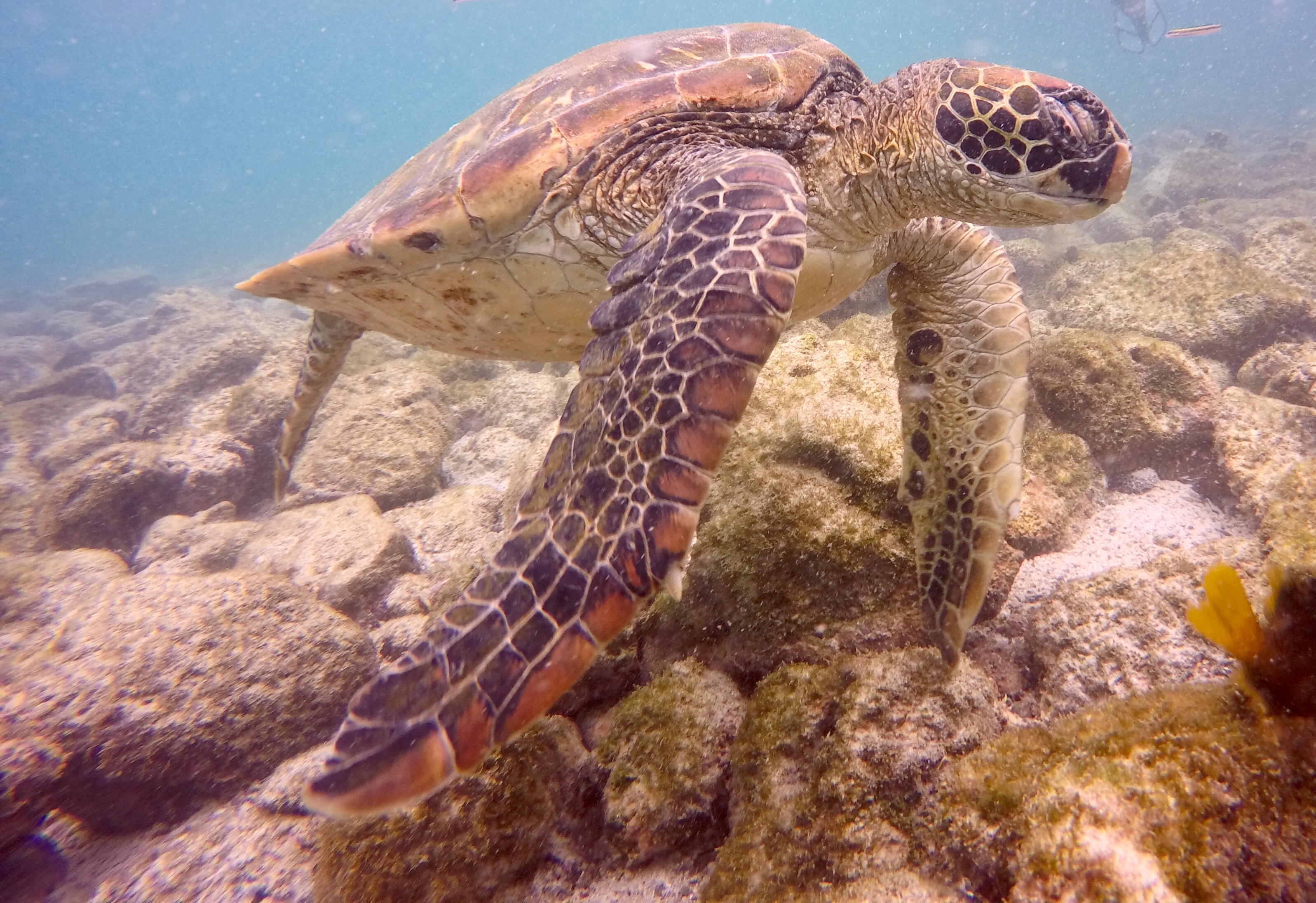 Um 11 Uhr 15 wurden Paul und ich dann schon wieder abgeholt, da wir die Tour „Los Tunneles“ gebucht hatten. Also wieder rauf auf das nächste Schnellboot und zusammen mit 7 weiteren Schnorchelbegeisterten wieder hinaus aufs Meer zum ersten Unterwasserspot. Bereits auf dem Weg dorthin erblickten wir vom Boot aus mehrere Riesenmantas mit gut 4 Meter Länge. Die waren so breit wie eine aufgeklappte Schultafel und schwebten an der Wasseroberfläche. Den ersten Halt kann man auch als Schildkrötenparadies bezeichnen. Alle paar Sekunden schwamm eine weitere an uns vorbei und wir waren noch nicht einmal im Wasser. Mit Taucherbrille und Schnorchel folgte ich darauf unserem Guide Darwin, der wirklich so heißt. Es dauerte nicht lange, bis er den ersten Oktopus in einer Felsspalte ausmachte. Anschließend suchten wir am Rand der Mangroven nach Schwarzflossenriffhaien und fanden einige, die uns relativ nah umkreisten. Von der Gruppe gelöst entdeckte Paul eine 1,30 Meter Schildkröte, auf welche ich ebenso stieß, nachdem ich eine Gruppe Golden Rays verfolgte und war jetzt schon hin und weg.