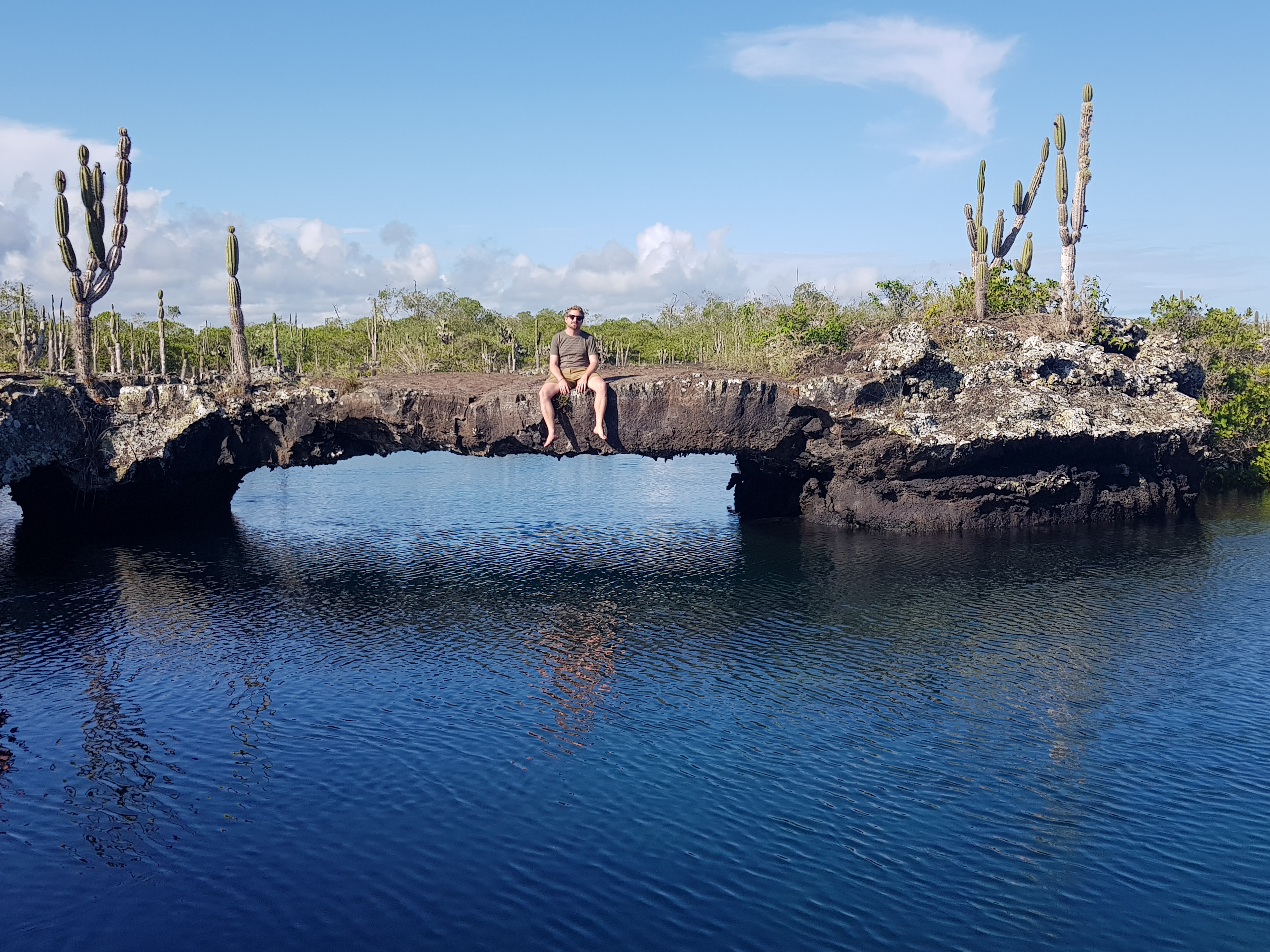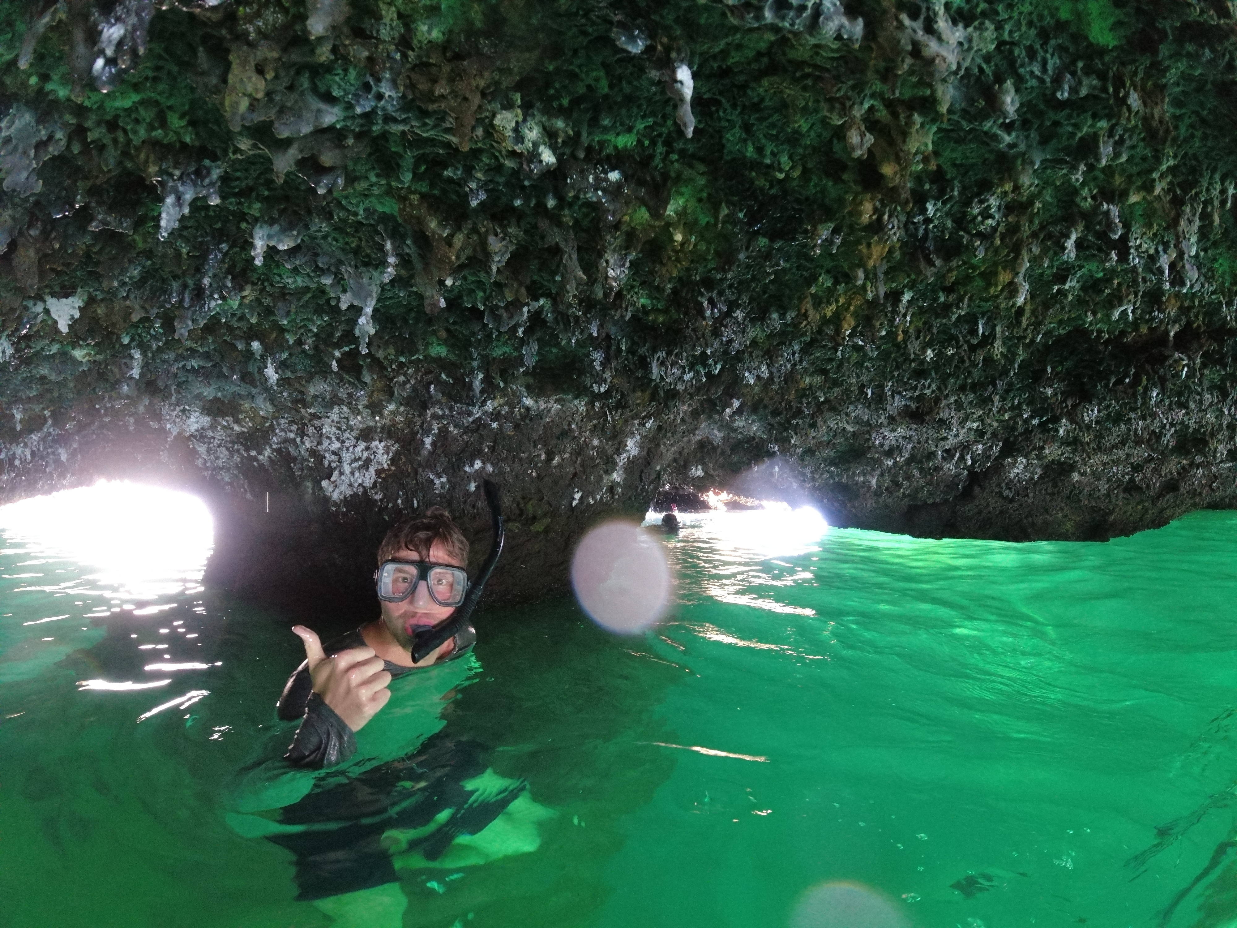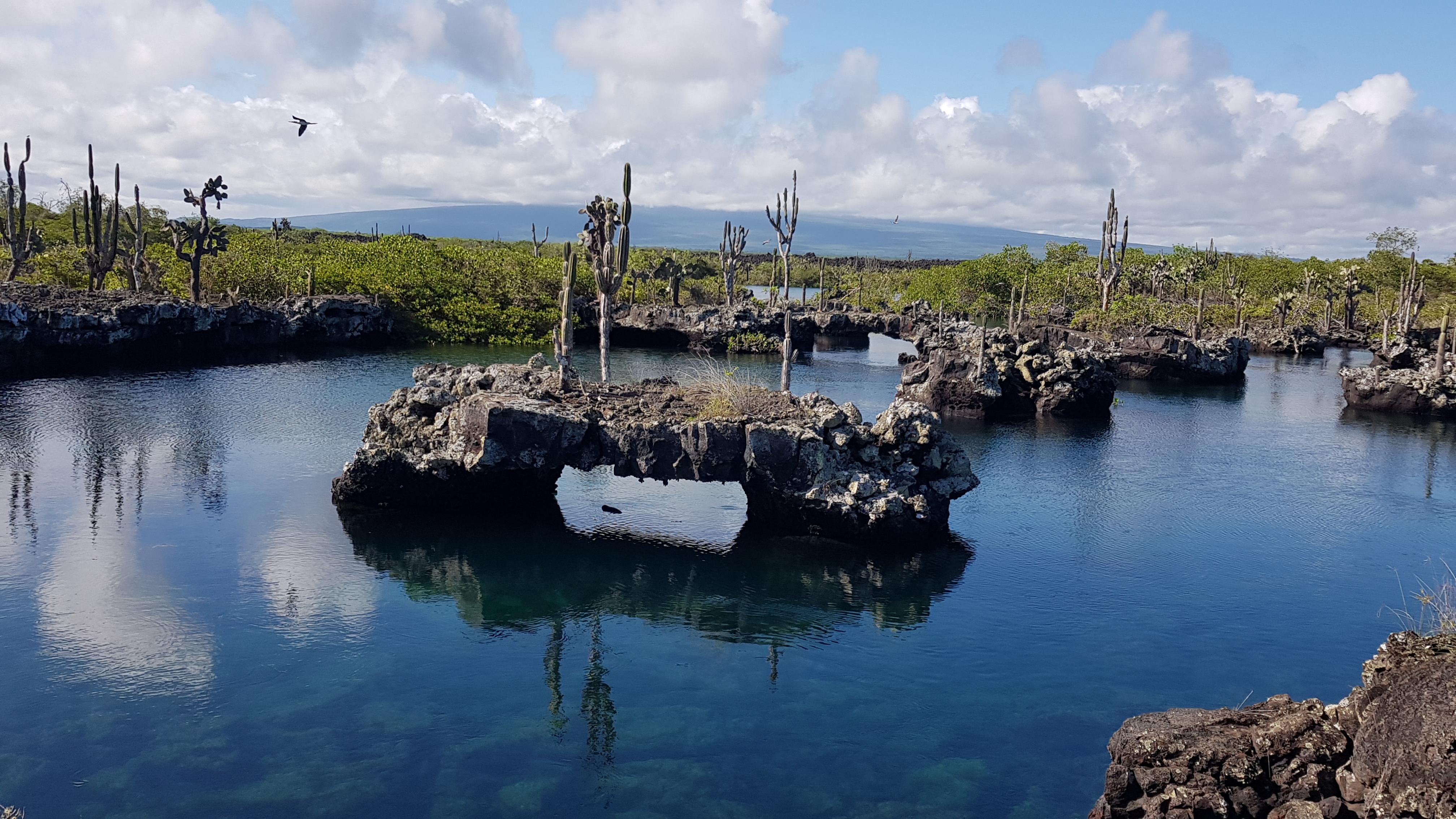 Daraufhin hieß es, ab aufs Boot, kurzen Snack zur Stärkung gönnen und weiter zu den „Los Tunneles“, einer erst vor 20 Jahren von Fischern entdeckten Lava – Seen – Landschaft mit unglaublich klarem Wasser und beeindruckenden Gesteinsformationen, durch die wir schnorcheln durften. Zahlreiche große Schildkröten und Fische tummelten sich auf kleiner Fläche. Zudem begrüßte uns direkt ein frecher Seelöwe und ein Mantarochen kreuzte unseren Weg.