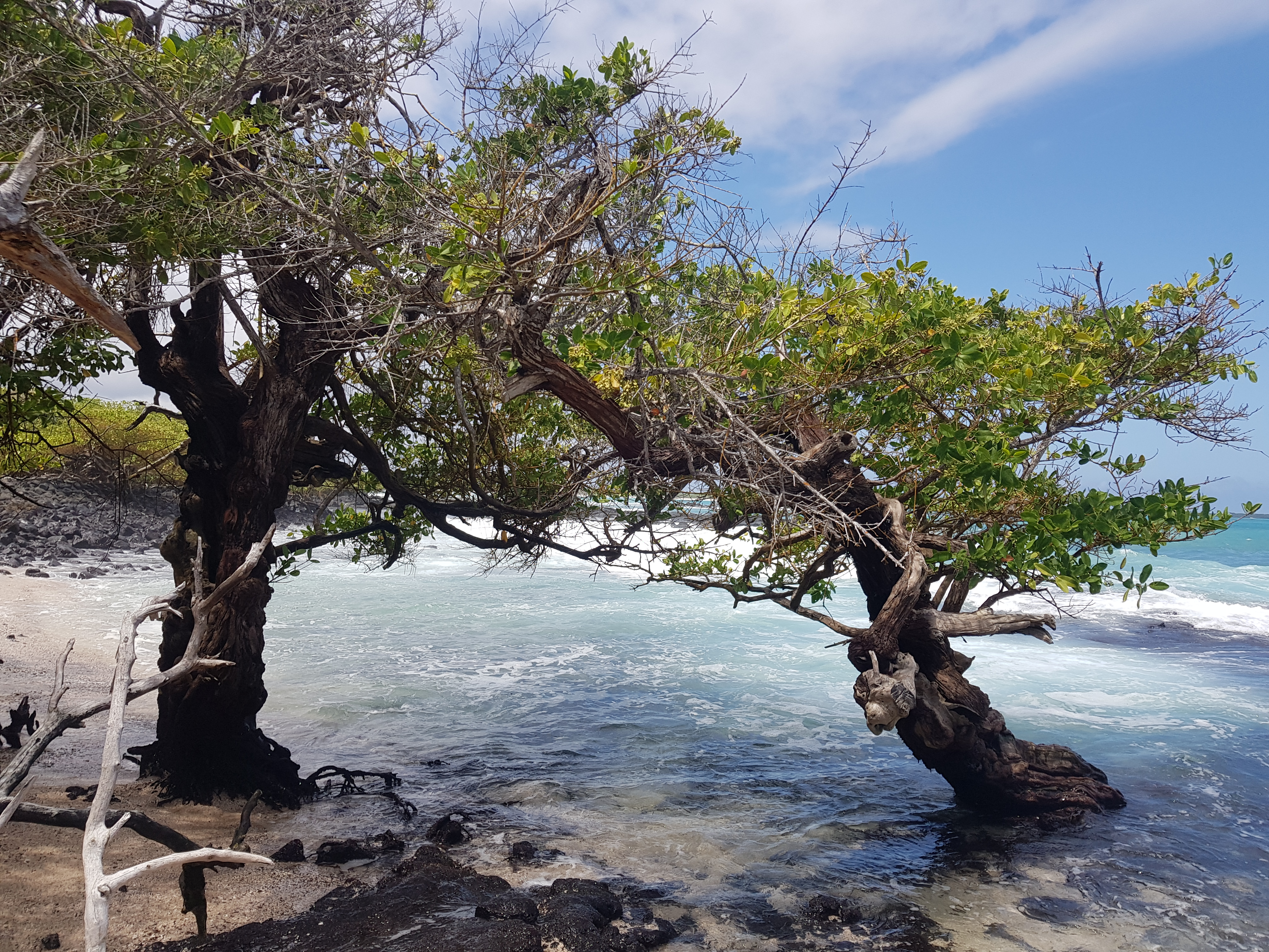 Auf der Höhe fixierte uns sogar ein Adler, der genauso wie bisher die gesamte Tierwelt völlig entspannt in unser Angesicht auf einem Stumpf für uns posierte, wie Echsen, Vögel oder die Schildkröten, welche wir heute angetroffen hatten. Für uns beide ist dies mitunter ein Grund, wieso die Galapagos – Inseln so einzigartig sind. Daneben herrscht eine wunderschöne Natur vor, in der alle symbiotisch zusammen leben. Eine traumhafte Kulisse fanden wir auch, nachdem wir durch einen Mangrovenwald hindurch liefen und an einem Fluss herauskamen. Diesen durchwateten wir, bis wir sogar aufs offene Meer stießen, in dem sich Süßwasser und Salzwasser vermischten.