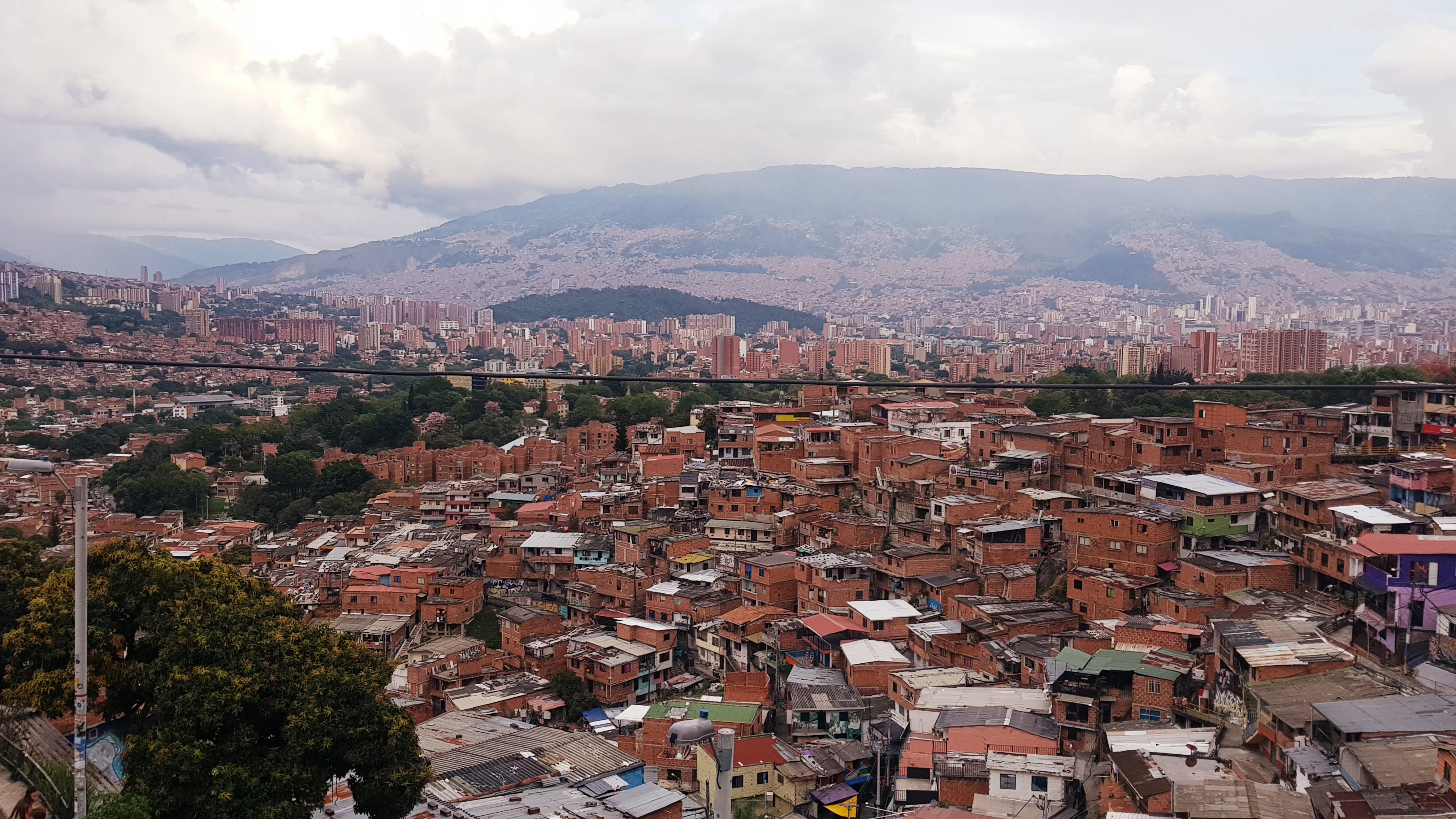 Dazwischen jedoch, versuchten wir vergeblich gute Tickets, nicht gerade im heißen Ultrabereich, fürs heutige Fußballspiel zu bekommen. Mit zwei Holländern der Free Walking Tour fuhren wir mit der Metro zum Stadion, fanden keinen offiziellen Ticketschalter, aber eine Menge Schwarzmarkthändler. Irgendwo war uns das allerdings zu riskant, da die „Tickets“ einfach schwarzweiß ausgedruckte QR – Codes waren und eigentlich niemand einen vertrauenswürdigen Eindruck machte. Zudem hieß es online, dass die uns angebotenen Plätze bereits ausgebucht seien. Auch wurde die Zeit zur Graffiti – Tour durch die Comuna 13 knapp und Wout und ich machten uns auf den Weg zum Treffpunkt an der Metrostation in El Poblado. Guide Walter nahm uns in Empfang und mit zwei Schweizern und drei Mädels aus New York nahmen wir die Metro zur Cable Car – Station. Von oben konnten wir einen guten Blick in den Talkessel, sowie auf die Barrios, die Armenviertel, und speziell das Comuna 13 – Viertel werfen.