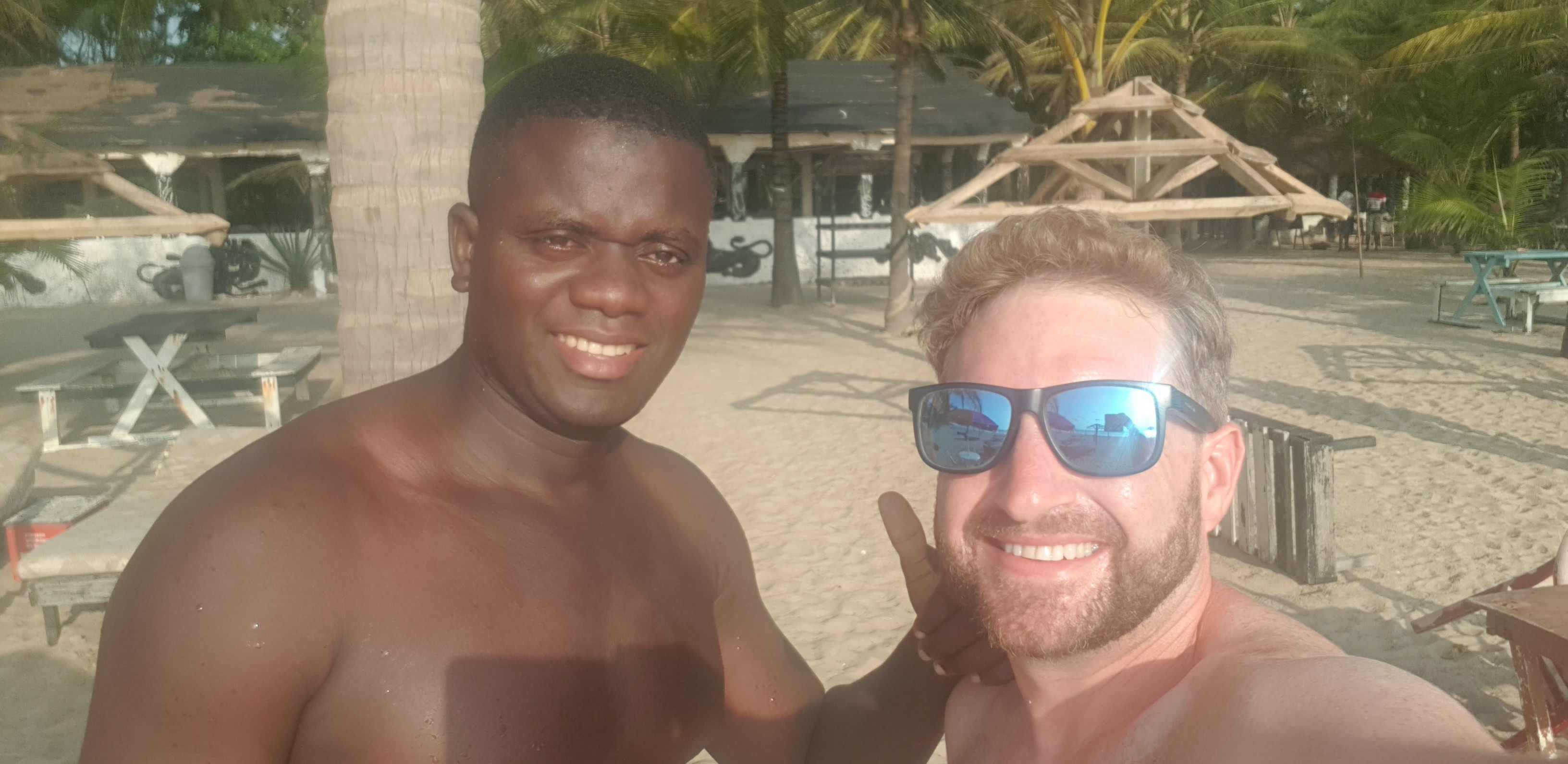 Nach einem Spaziergang habe ich mich mit Fred ins „Senegambia Beach Hotel“, in dem er untergebracht ist, an den Pool geschlichen. Da war tatsächlich was los und man merkt, dass mittlerweile vermehrt Touristen landen. Das wird Land und Leuten zumindest kurzfristig helfen und die finanzielle Lage verbessern.