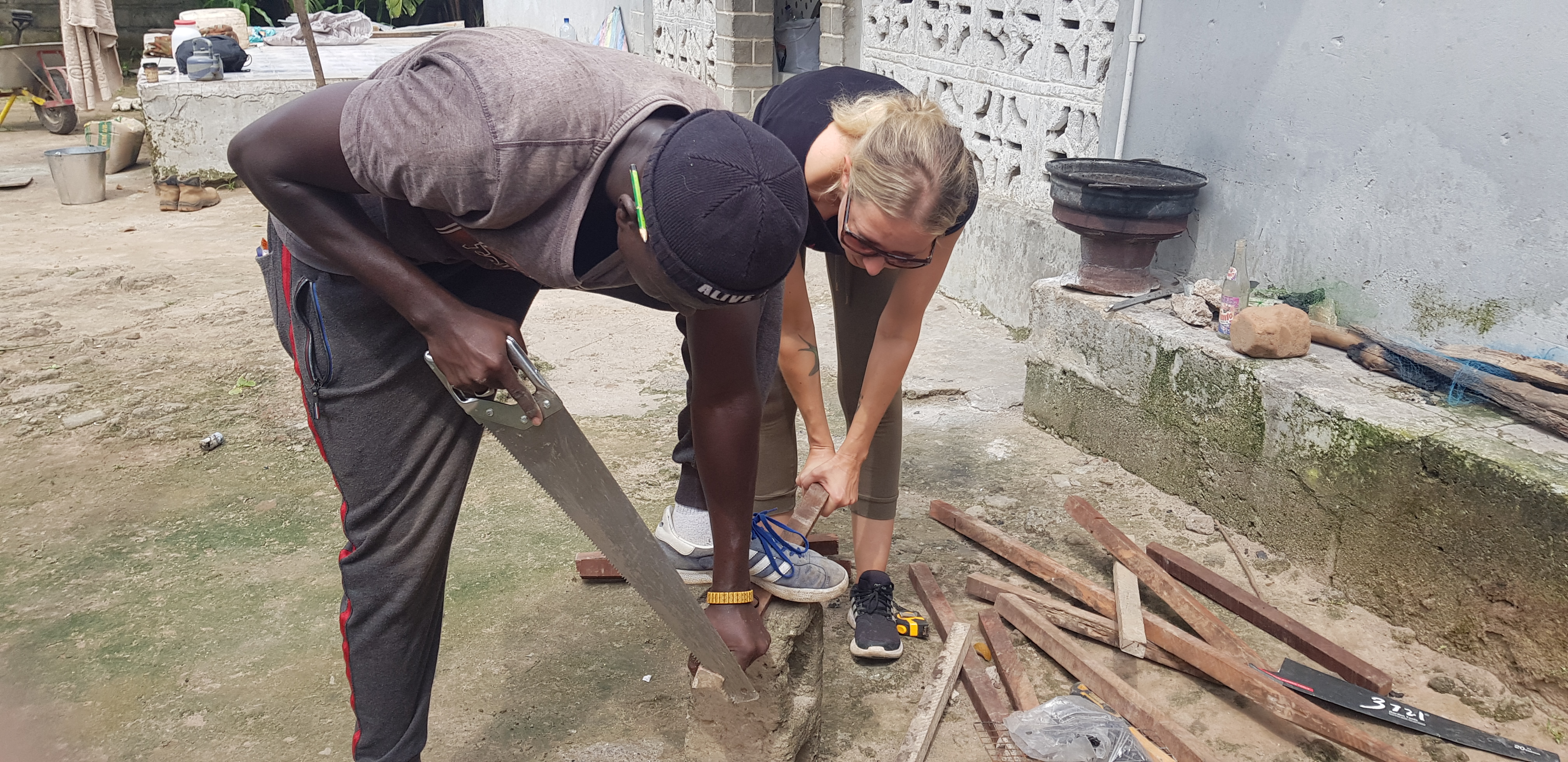 An meinem ersten Ofenbautag ließ ich mir es nicht nehmen, Bakary und Solomon unter die Arme zu greifen. Und auch Praktikant Musa brachte sich mit viel Eigeninitiative motiviert ein.