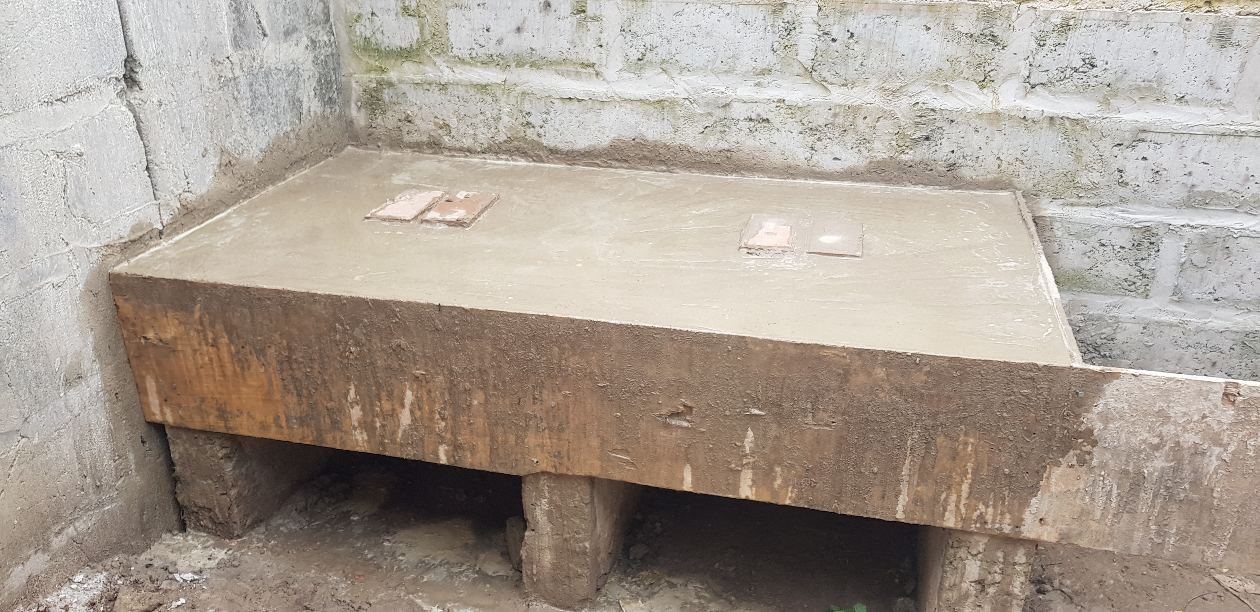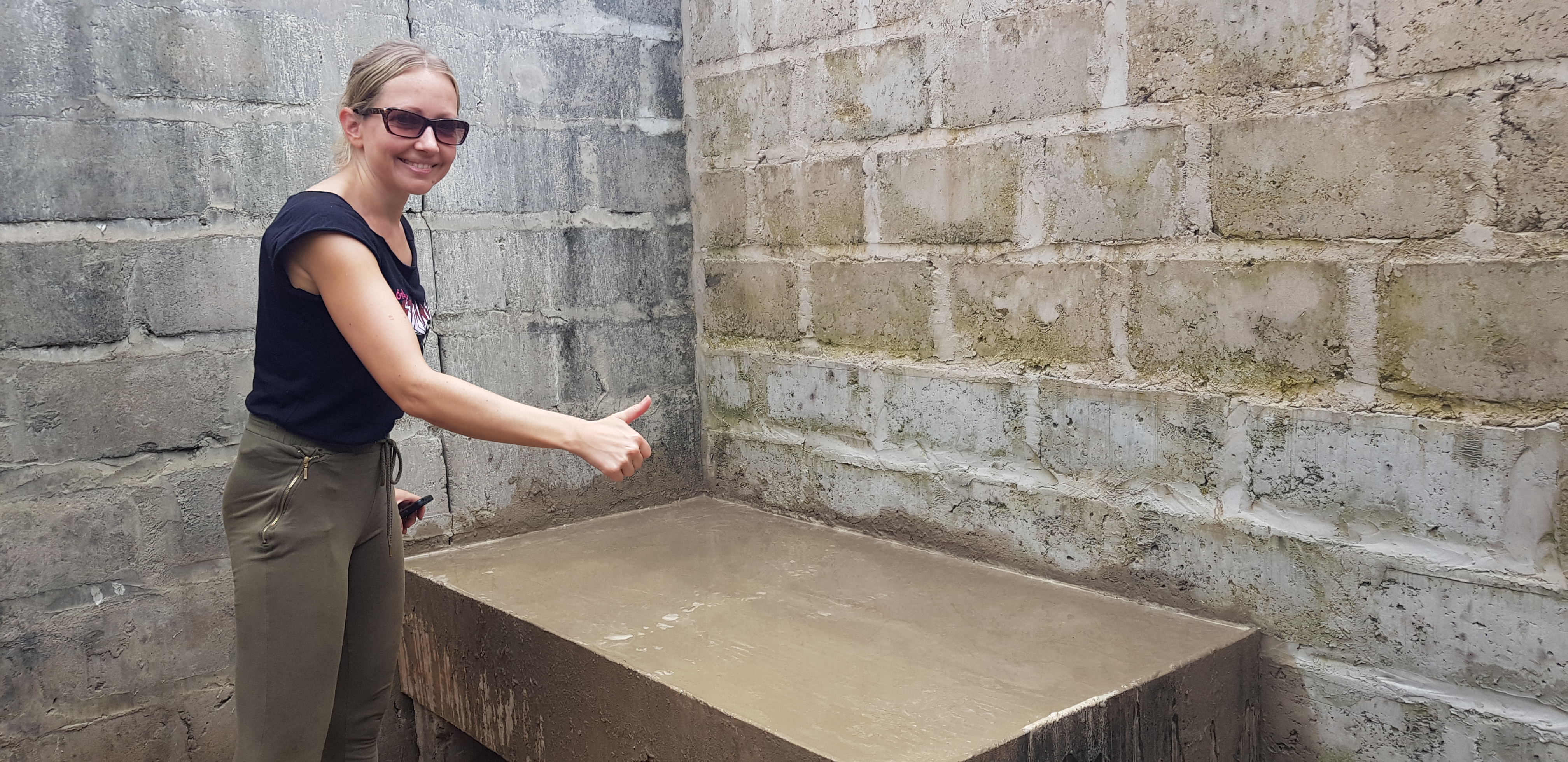 Hinzu kam eine Verkleidung für die Front und die offene Seite. Nun konnten Sand, Zement und roter Kies mit Wasser zusammen zu Beton vermischt werden. Dieser musste letztendlich in die Verschalung geschaufelt und mit der Kelle glatt gestrichen werden.