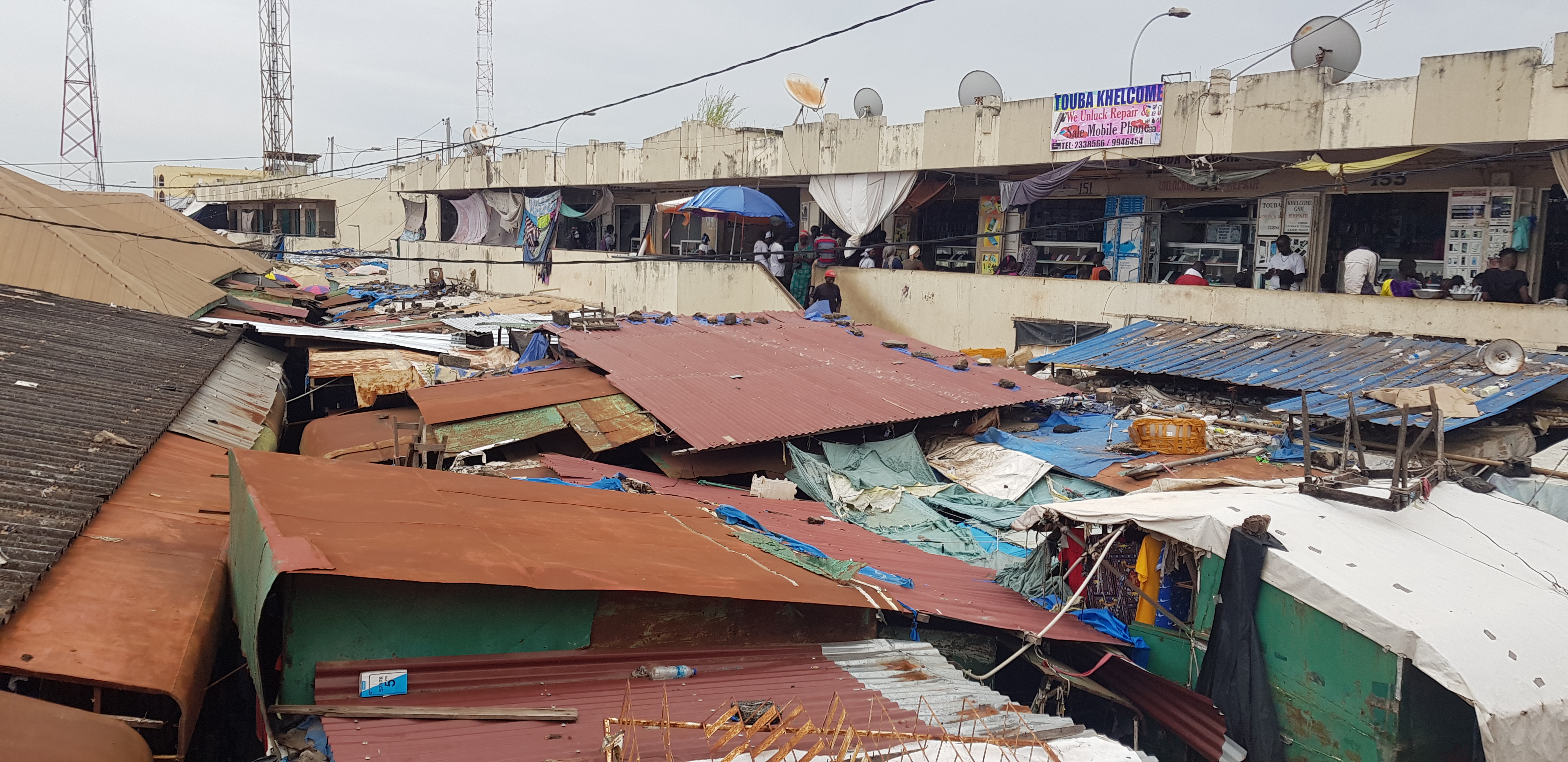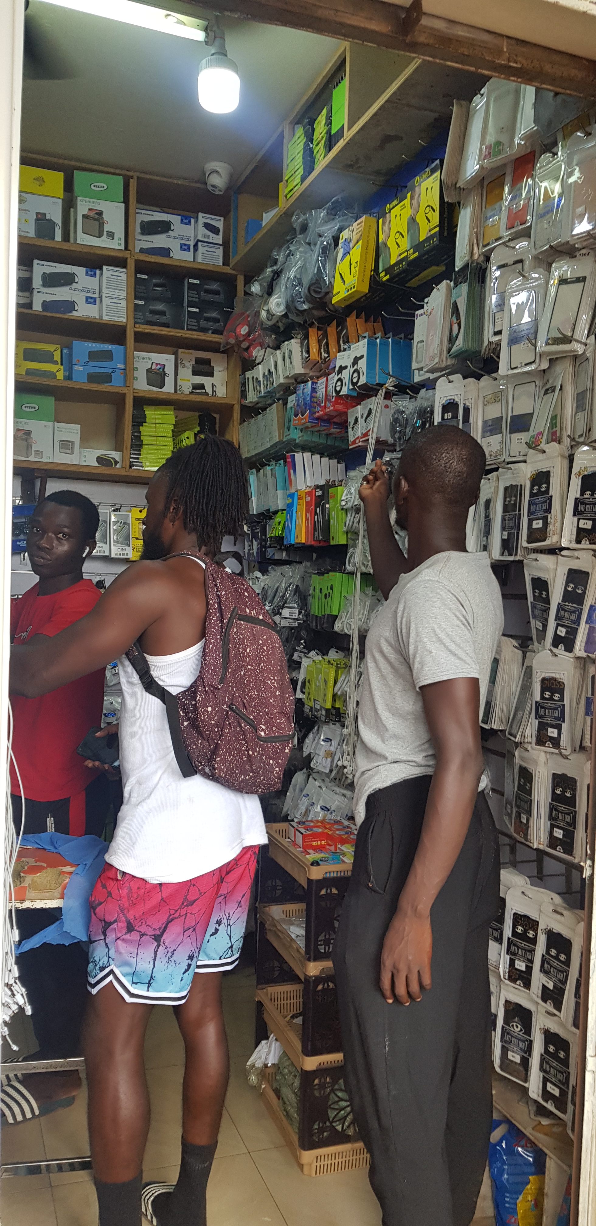 Während draußen auf den Straßen schon reges Treiben herrschte und man legale Waren an lizensierten Ständen erwerben konnte, sah es im Gewirr zwischen den Häuserblöcken ganz anders aus. Wir suchten uns den Weg durch enge, verwinkelte Gassen mit provisorischen Verschlägen, wo sich unzählige Kaufwillige und Verkäufer tummelten. Ob Kleidung, Technikzubehör, Essen, Stoffe, Holzarbeiten, Schmuck, Uhren, Schreibwaren, Eisenwaren, Schuhe … das Angebot war groß, aber nicht wirklich großartig. Second Hand, Helerware oder Diebesgut wechseln täglich, neben Billigprodukten aus China den Besitzter, manchmal mehr, meist aber weniger legal, wie mir die Jungs berichteten. Das gab für mich den Anlass, mit Sam über die Auswirkungen des Schwarzmarkts auf den Arbeitsmarkt zu sprechen oder was das Verschiffen von Second-Hand-Kleidung oder Elektroschrott aus Europa in die afrikanischen Länder bewirkt. Die heimischen Schneidereien verlieren Aufträge. Seltene Metalle in Handy- oder Computerchips, wie auch größeren Elektrogeräten werden oft von Kindern auf der Deponie durch ein giftiges Brennverfahren, welches die Atemwege angreift und Dauerschäden verursacht, herausgeschmolzen. Man steckt also zuerst einmal in einem Dilemma, wenn man seine nicht mehr benötigten Klamotten in den Altkleidercontainer oder das aussortierte Handy abgeben möchte. Grundsätzlich sollten Produkte so lange wie möglich im Warenkreislauf bleiben und anschließend über einen entsprechenden Anbieter sauber recycelt oder vielleicht sogar von einem selbst upgecycelt werden.